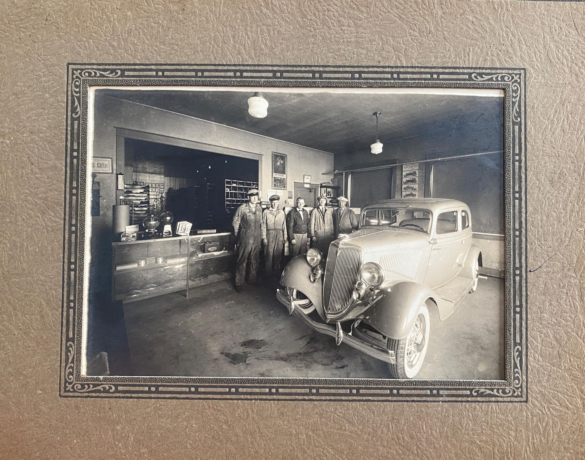 Left to Right - William Talmo, Shop Foreman; Elmer Sorum, Mechanic; Ole Dammen, Bookkeeper & Parts Man; a Ford Motor Company Representative; and R. T. Jahr.Cataloged By
