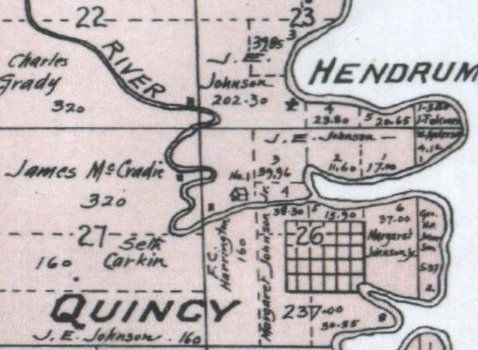 Elm River School No. 1 was located near Quincy in the NW Qtr. of Sect 26 (see 1900 map, below). In 1887, Quincy was important port on the Red River and later was abandoned when the Great Northern Railroad line overtook shipping in the Rid River Valley.Acquisition