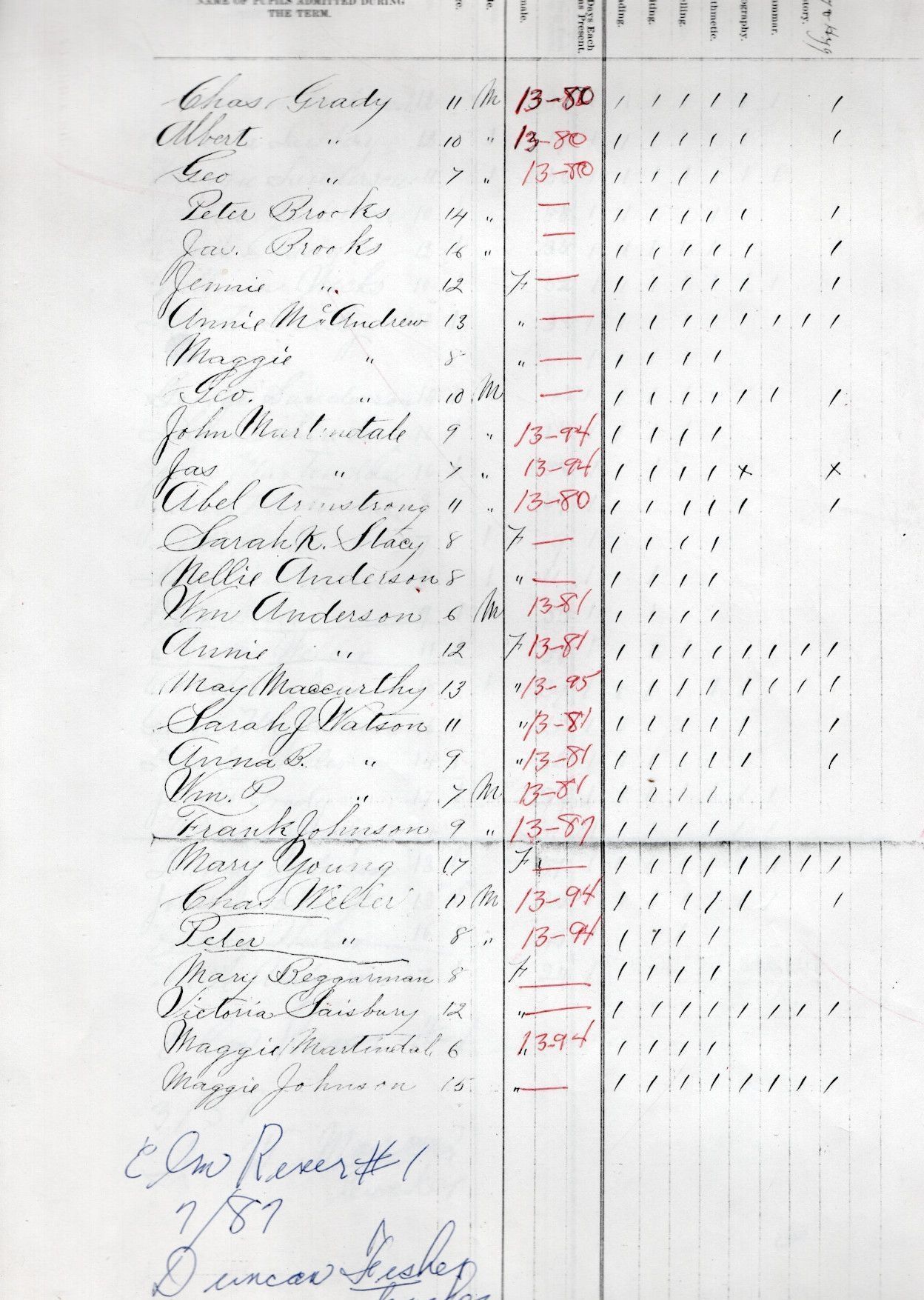 In July 1887, Elm River School No. 1 Teacher Ducan Fisher reported attendances and studies pursued for 28 students, including: Annie Anderson, Nellie Anderson, Wm. Anderson, Abel Armstrong, Mary Beggarman, Jas. Brooks, Jennie Brooks, Peter Brooks, Albert Grady, Chas. Grady, George Grady, Frank Johnson, Maggie Johnson, May MacCarthy, Jas. Martindale, John Martindale, Maggie Martindale, Annie McAndrew, George McAndrew, Maggie McAndrew, Victoria Saisbury, Sarah Stacy, Anna Watson, Sarah Watson, Wm. Watson, Chas Weller, Peter Weller, and Mary Young.