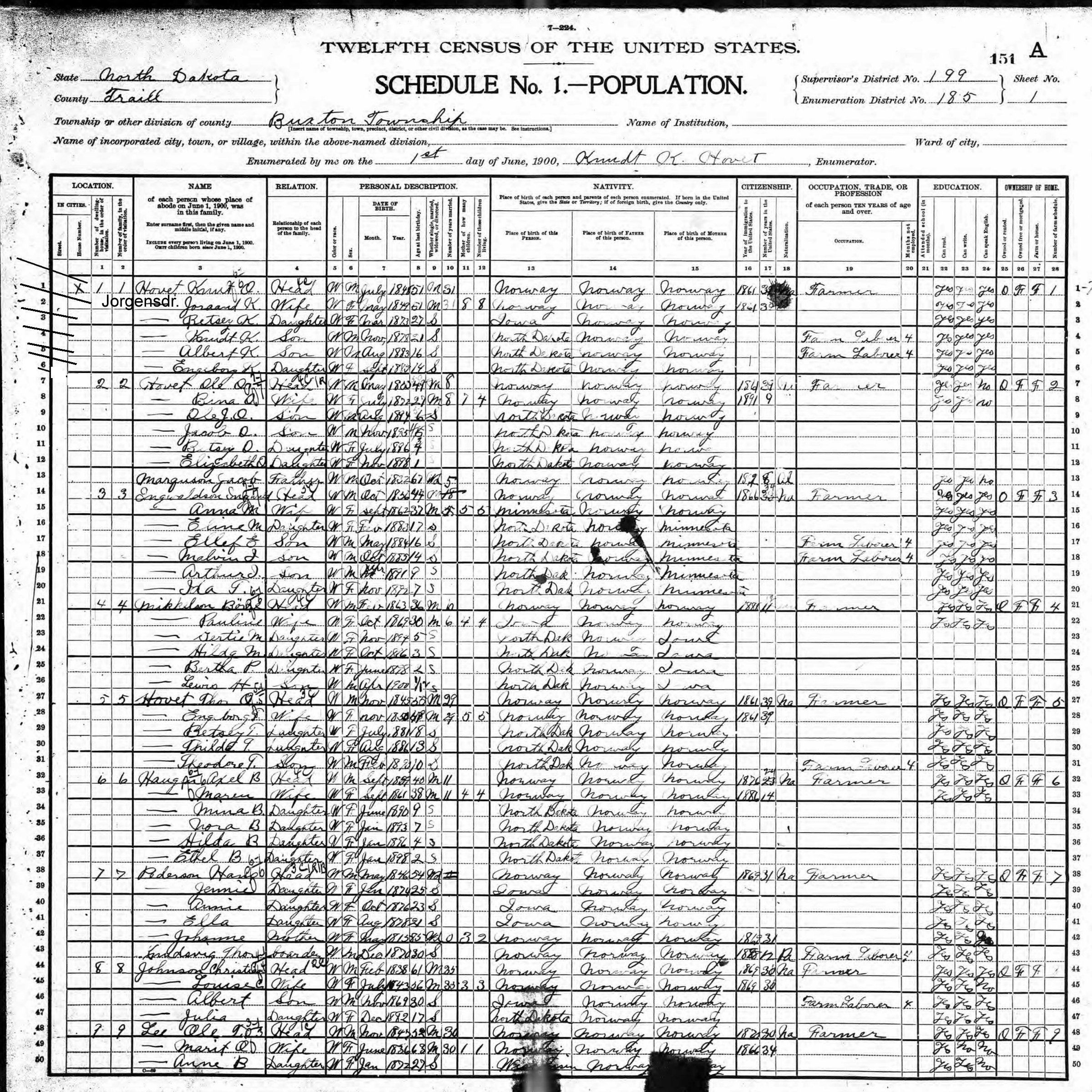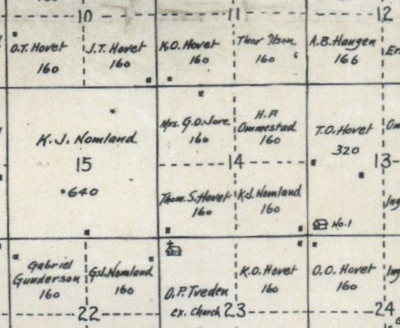 Knudt Oleson and Julia (Jorgensdr.) Hovet had eight children (family tree, below). Their first three, Ole K, John K. and Betsy K. Hovet were born in Winneshiek County, IA. But by 1874, Knudt and Julia had moved their family to Spring Grove, MN, as evident by their next two children, Tilda and Thomas Hovet, being born in Spring Grove. Then, in 1978 Knudt and Julia moved to E. Buxton Township in Traill County, Dakota Territory, with their last three children, Knut K., Albert K. and Engeborg K. Hovet, being born in Buxton. Knudt and Julia's homestead was in the northeast quarter of section 23 (1900 plat map, below). Their neighbors were Knudt's brothers, Ole O. Hovet and Thor O. Hovet.