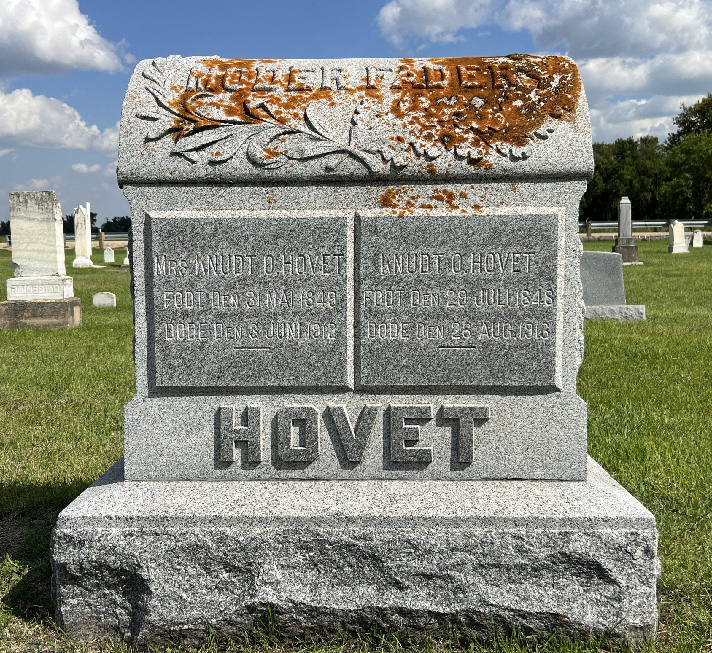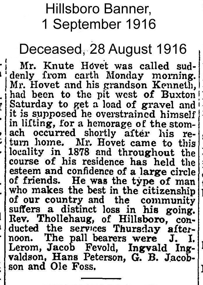 In the 1900 US Census (below), we can see that Knudt Oleson used Hovet as his family name. By 1900, Knudt and Julia's sons, Ole Knutson Hovet, John Knutson Hovet and Thomas Knutson Hovet were no longer residing with their parents on the farm in Buxton Township. Daughter Betsy Hovet remained on the home farm, as did sons Knut, Albert and Engeborg Hovet. By the 1915 ND Census (below), Knudt O. Hovet was widowed and lived and farmed with his son Albert and family. Julia (Jorgensdr.) Hovet passed away on 12 June 1912 at age 64. Julia was interred in the Hillstead Cemetery east of Buxton, ND. About a year after the 1915 Census, Knudt O. Hovet died, age 69, on 28 August 1916 (Hillsboro Banner Obit, below). Knudt was buried next to Julia in the Hillstead Cemetery (grave monument, below).Acquisition
