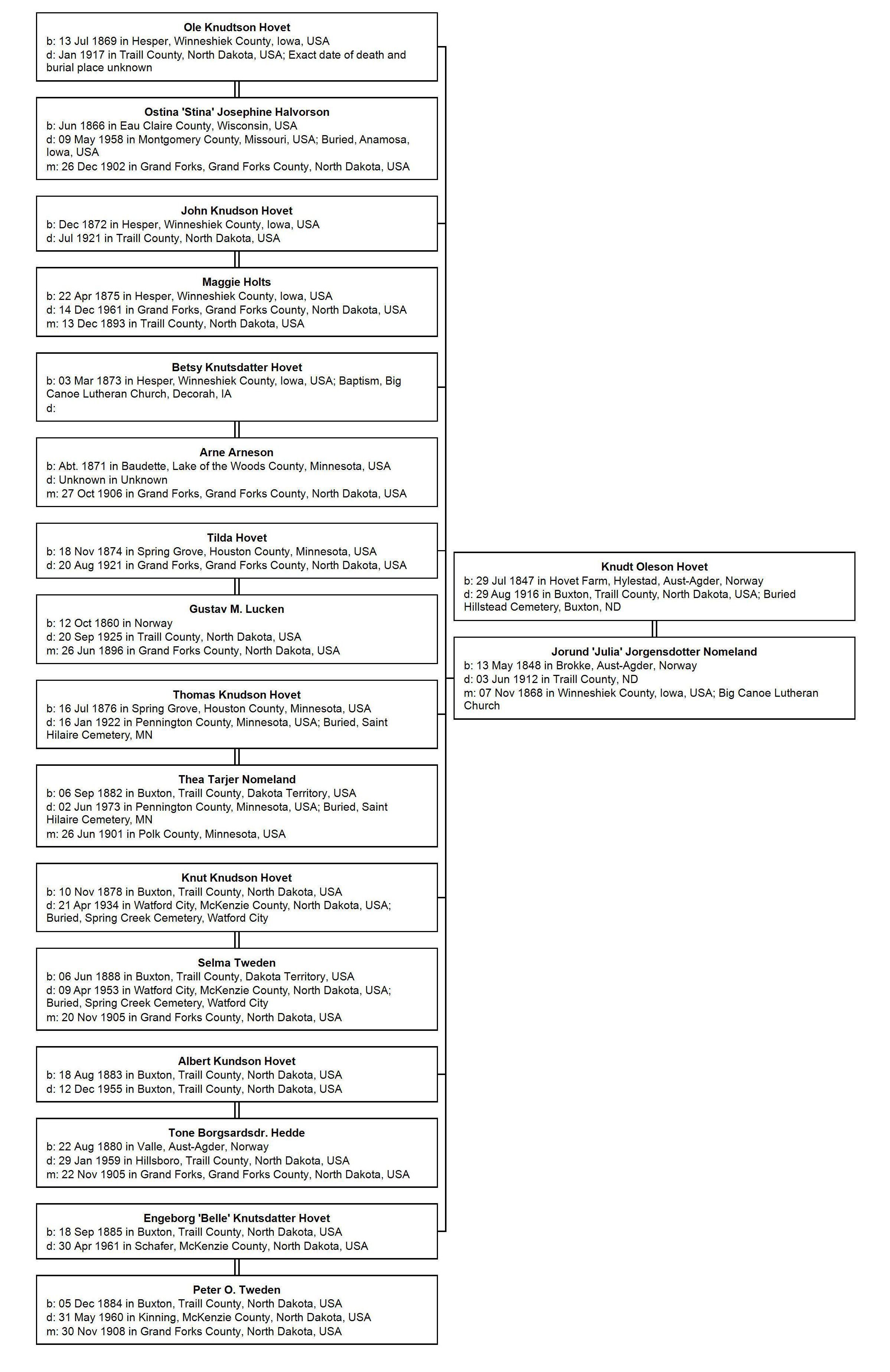 Knudt O. and Julia Hovet had eight children: Ole K., John K., Betsy K., Tilda, Thomas K., Knut K., Albert K. and Engeborg K; their lives are briefly described as follows: