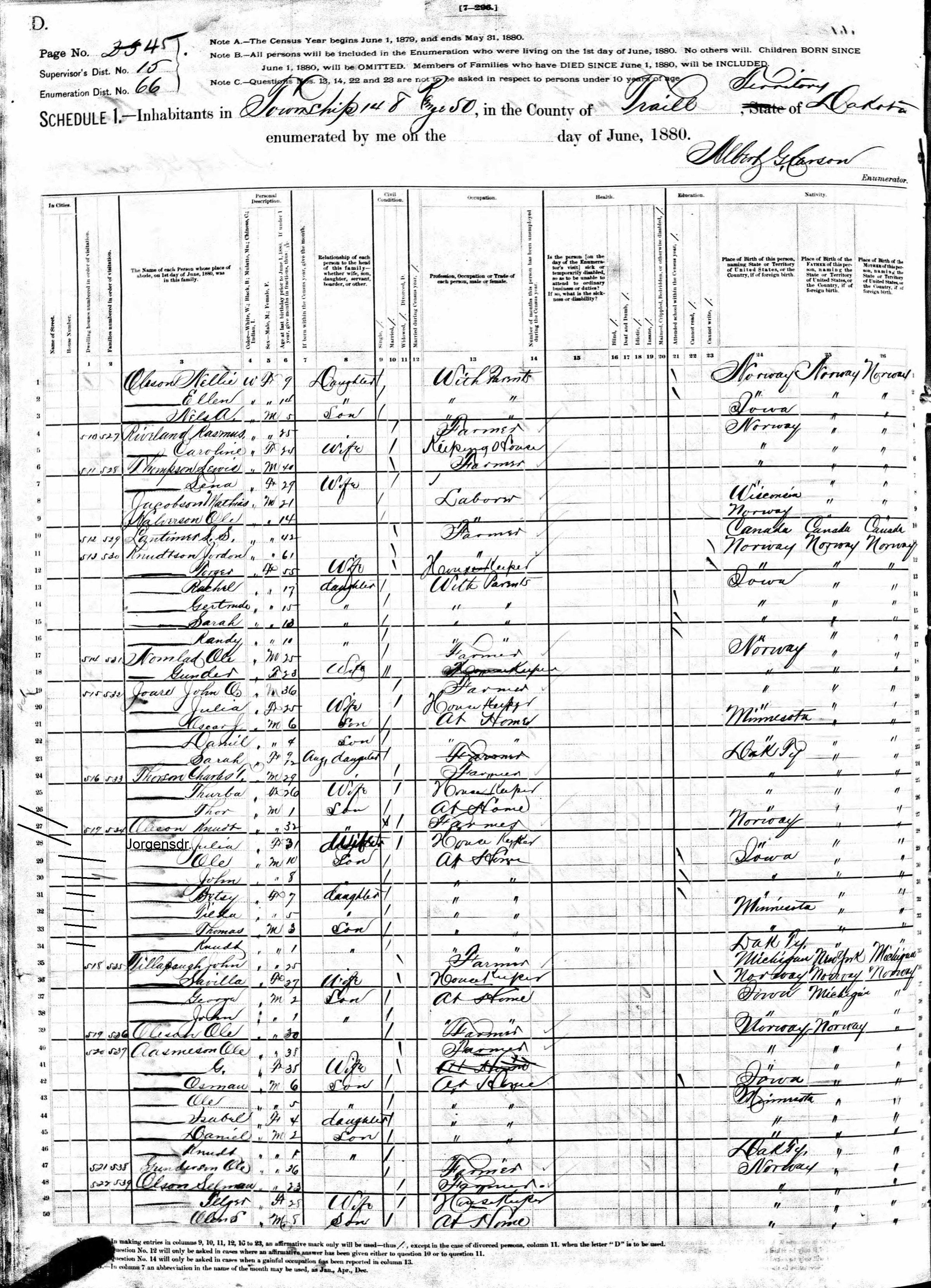 Bergit 'Betsy' K. Hovet was born on 3 March 1873 in Hesper Township in Winneshiek, IA (Neumann Family Tree, Ancestry), and baptized on 23 March 1873 in the Big Canoe Lutheran Chruch by Decorah, IA (ELCA record). Betsy came to settle in Traill County, DT, with his parents and siblings in 1878, and was age eight in the 1880 US Census for Traill County (below). At the time of the 1900 US Census (below), Betsy was 27 and remained on the home farm in Stavanger Township. Six years after this 1900 Census, Betsy K. Hovet, age 33, married Arne Arneson, age 34, on 27 October 1906 in Grand Forks (ND marriage record). Arne was born in about 1871 in Baudette, MN, to parents Hans and Siri Hovet. In the 1880 US Census for Traill County, Arne was age 9 and was with his parents and an older sister, Inger (11) and younger brothers Even (7), Gilbert (6), Johan (3) and Loris (1). In 1919, Betsy Arneson was summoned to a Traill County court hearing to settle the estate of her father, Knudt O. Hovet after his passing in 1916 (Hillsboro Banner, 18 April 1919). Betsy's brother, John K. Hovet was administrator for the estate. No further records for Betsy K. (Hovet) Arneson were found.
