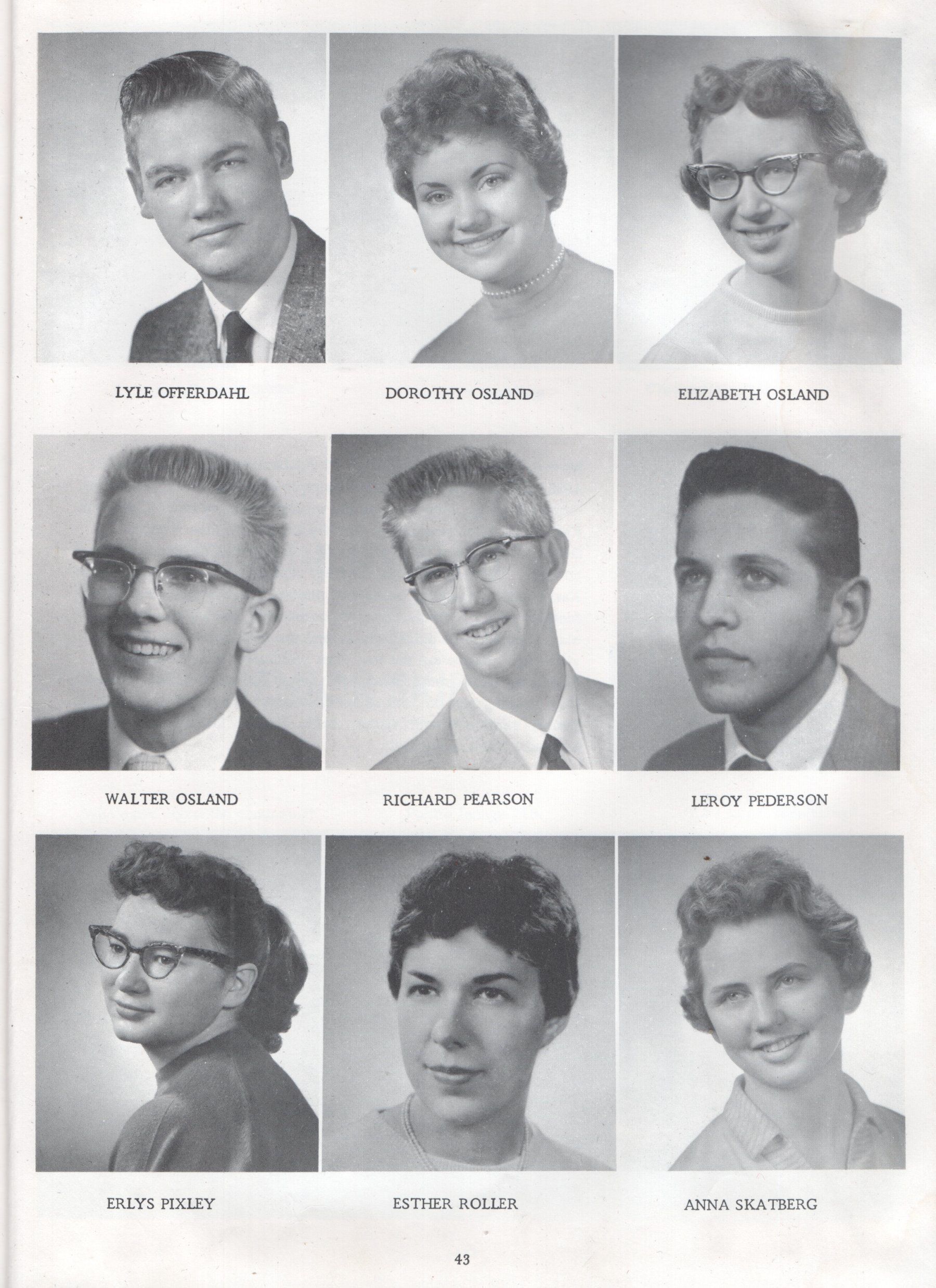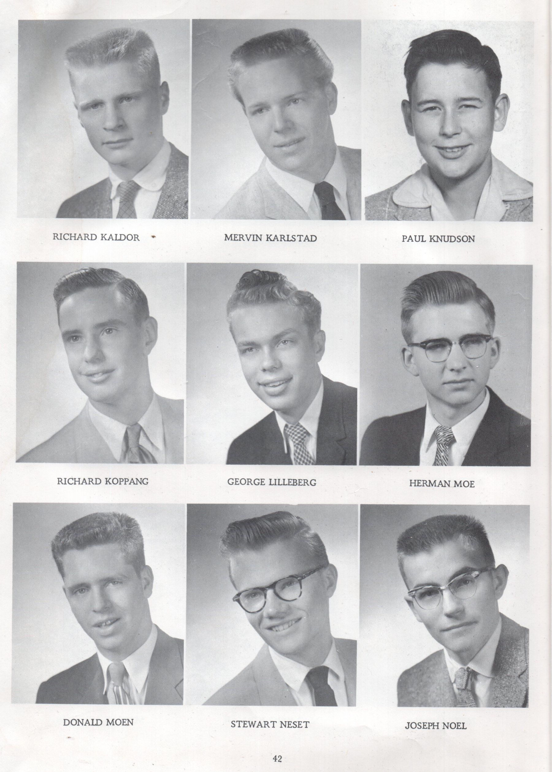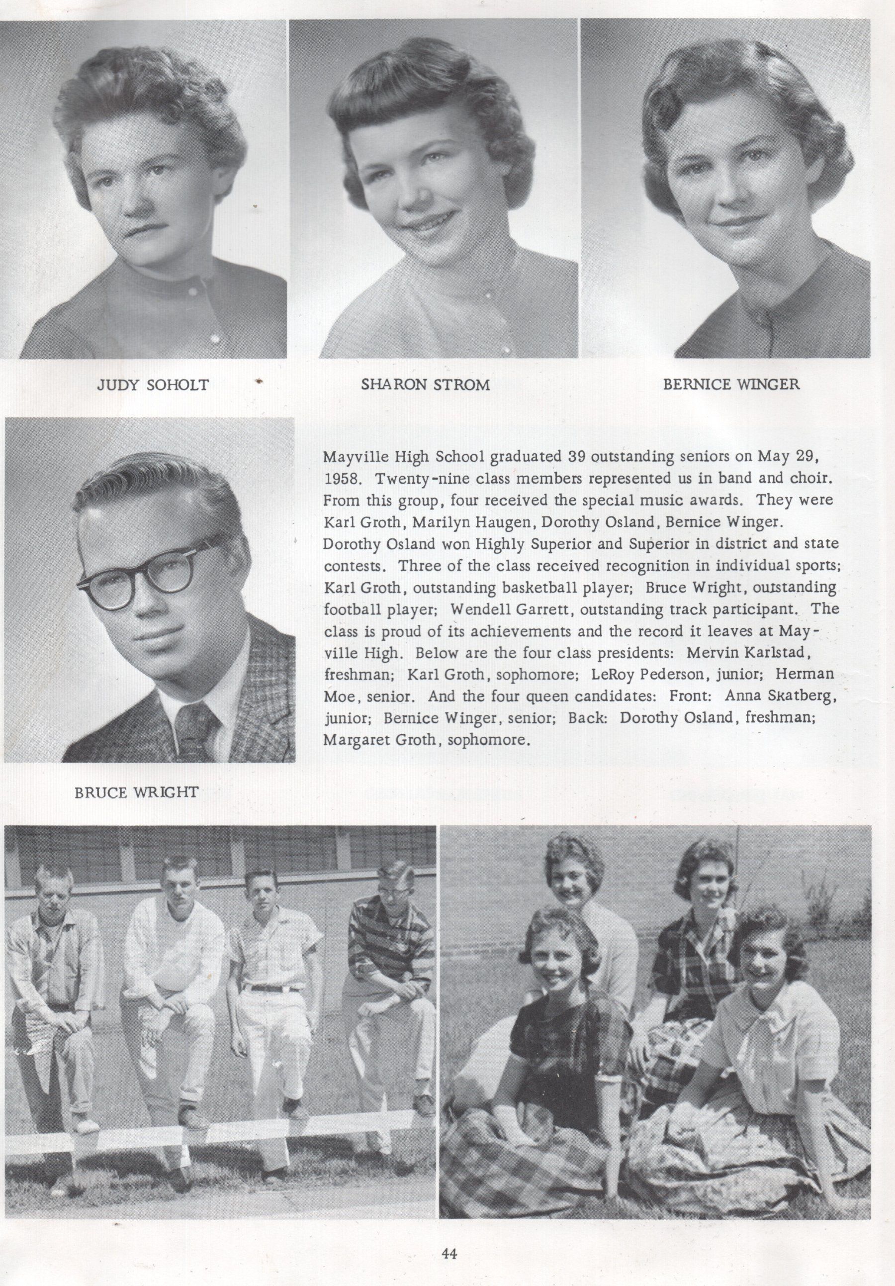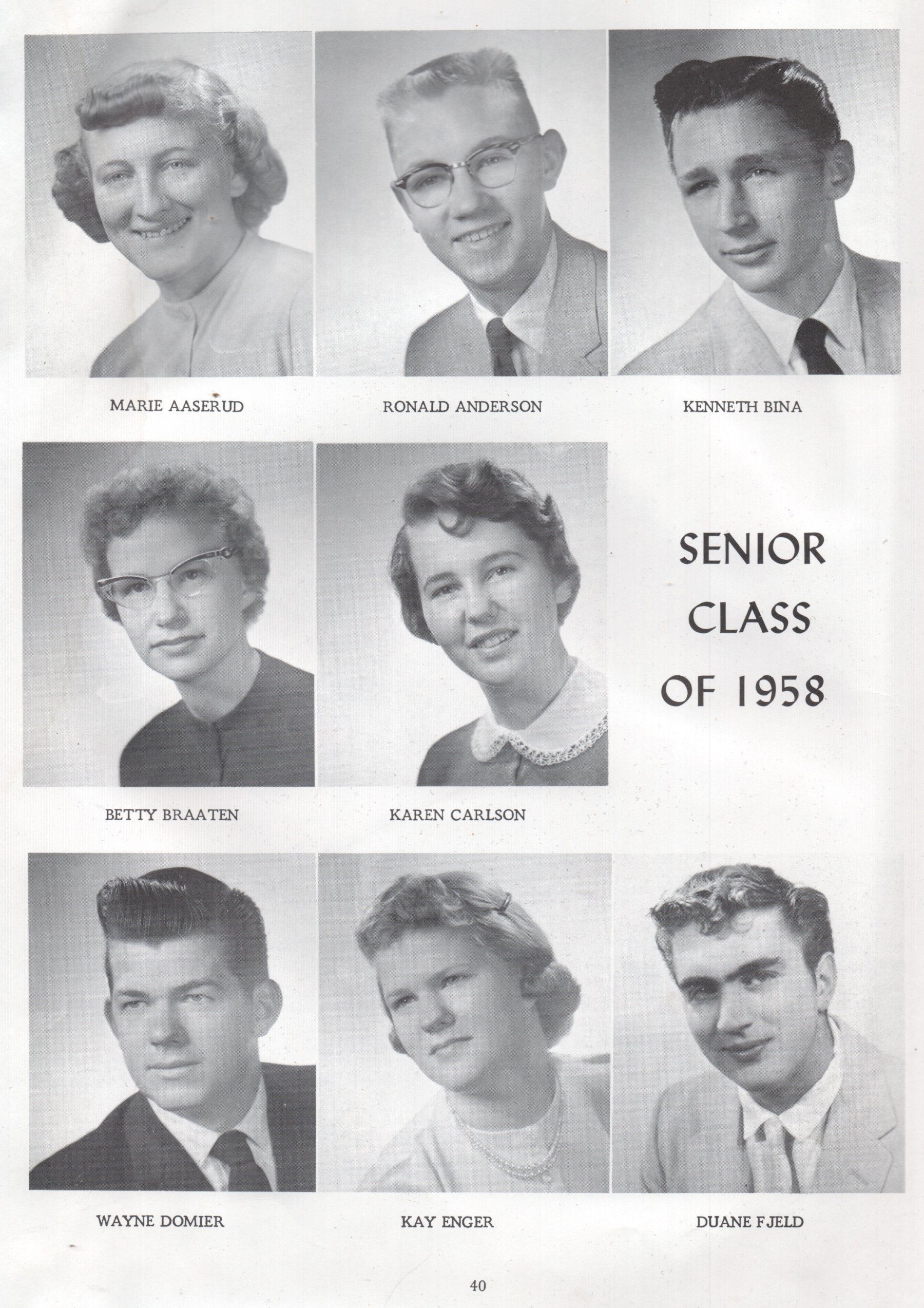 The 1958 graduating class of Mayville High School included five pages of photographs for 39 students: Marie Aaserud, Ronald Anderson, Kenneth Bina, Betty Braaten, Karen Carson, Wayne Domier, Kay Enger, Duane Fjeld, Wendell Garrett, Karl Groth, Margaret Groth, Myrna Groven, Duane Hart, Marilyn Haugen, Janice Hohl, Marjorie Holman, Marlys Johnson, Richard Kaldor, Mervin Karlstad, Paul Knudson, Richard Koppang, George Lilleberg, Herman Moe, Donald Moen, Stewart Neset, Joseph Noel, Lyle Offerdahl, Dorothy Osland, Elizabeth Osland, Walter Osland, Richard Pearson, Leroy Pederson, Erlys Pixley, Esther Roller, Anna Skatberg, Judy Soholt, Sharon Strom, Bernice Winger, and Bruce Wright.