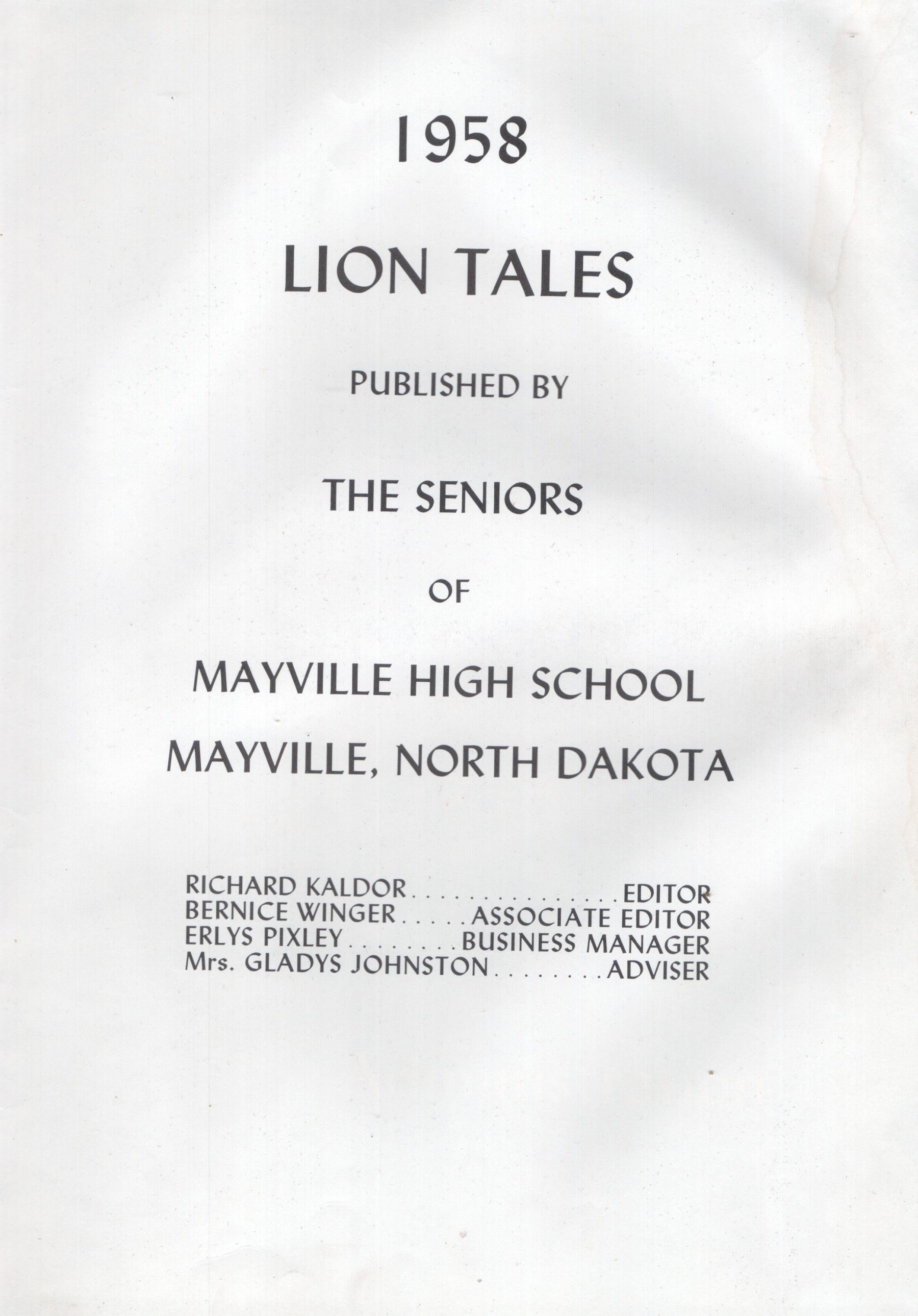 The 1958 Mayville High School Yearbook was titled: "1958 Lion Tales" and was published by the Senior Class.