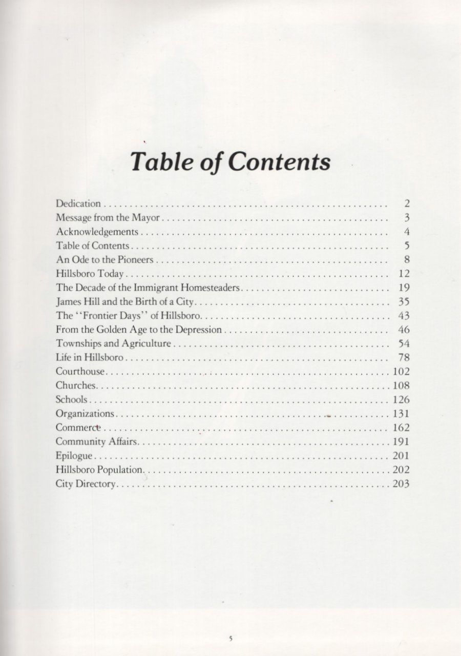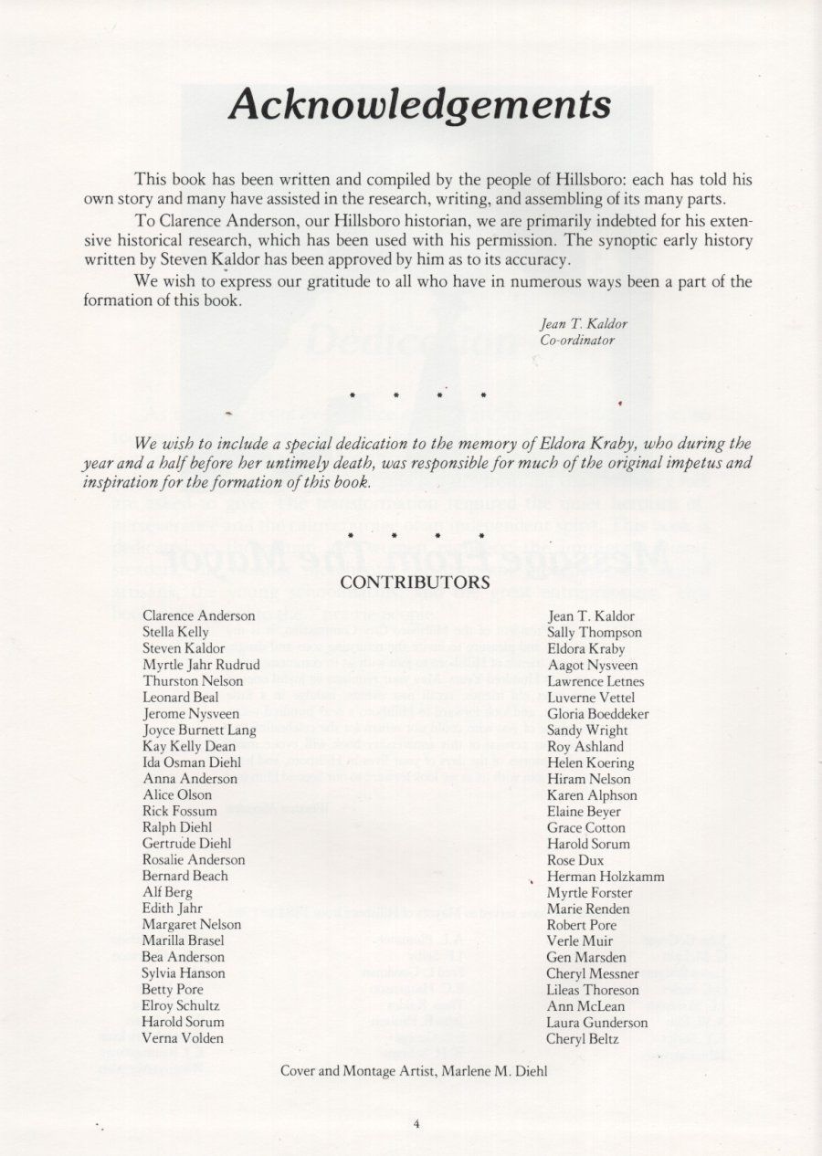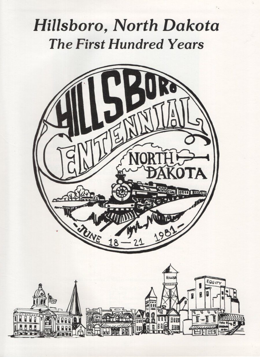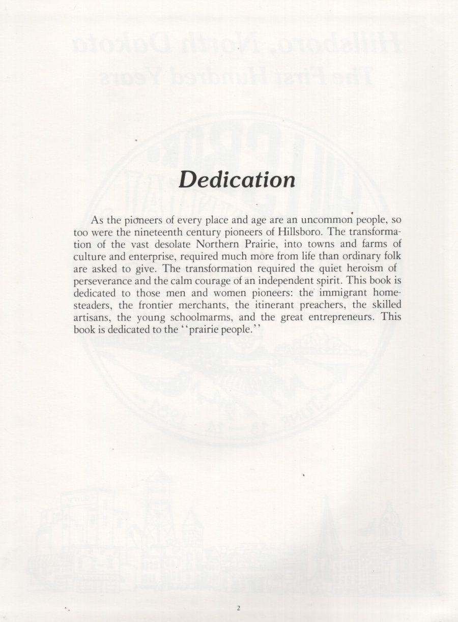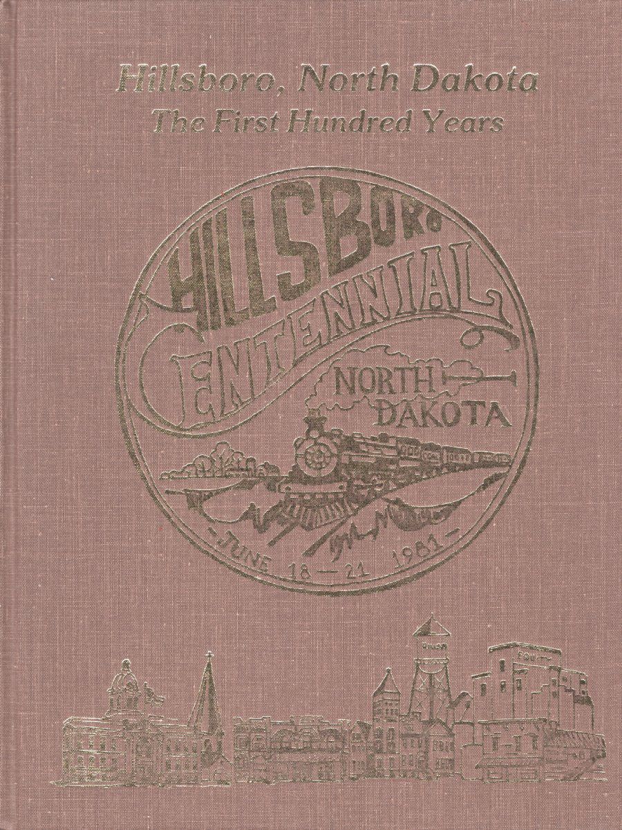 From 18 to 21 June 1981, the City of Hillsboro, ND, celebrated its Centennial (1881-1981). For this celebration, a 9" by 11", 255-page, brown book titled: "The First Hundred Years" was written and compiled by contributions from the people of Hillsboro, Jean T. Kaldor, Co-ordinator (see Acknowledgements and Contributors page, below). This book was dedicated "to those men and women pioneers: the immigrant homesteaders, the frontier merchants, the itinerant preachers, the skilled artisans, the young schoolmarms, and the great entrepreneurs...to the Prairie People" (see book Dedication page, below). This 255-page book includes a number of chapters, for example, a chapter on "The Frontier Days of Hillsboro and chapters on Hillsboro churches and schools (see book Table of Contents page, below).