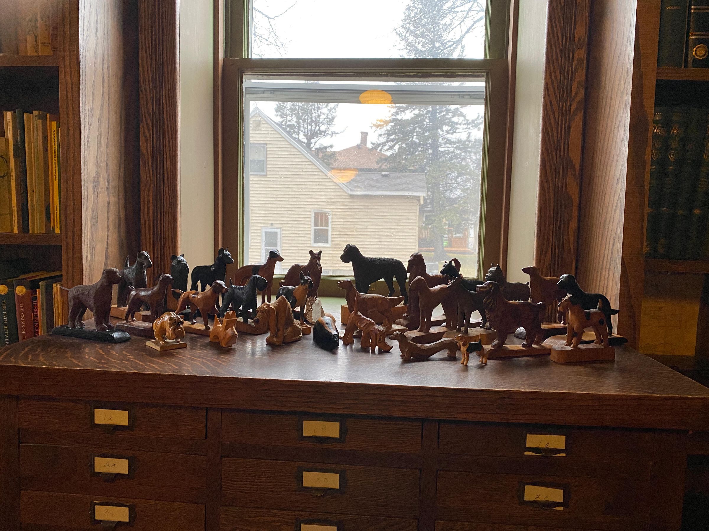 Hand-Carved Collection of 26 Dogs & a Skunk by Hobo McGee. The story goes that a Hobo named McGee lived in an area just outside of Hillsboro referred to as Hobo Town (in the area Woodland Park is now located in Hillsboro).