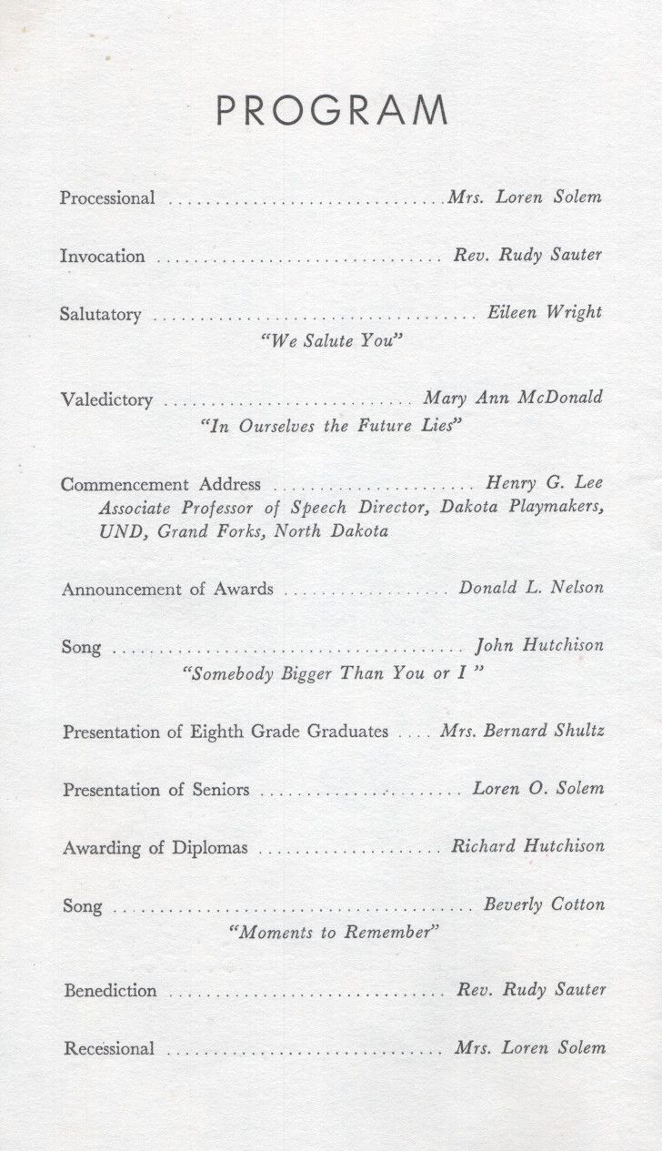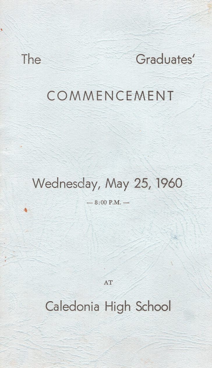 On 25 May 1960, the Commencement program for Caledonia High School and Eighth Grade graduates was held at Caledonia High School. The program began with a Processional and ended with a Recessional.