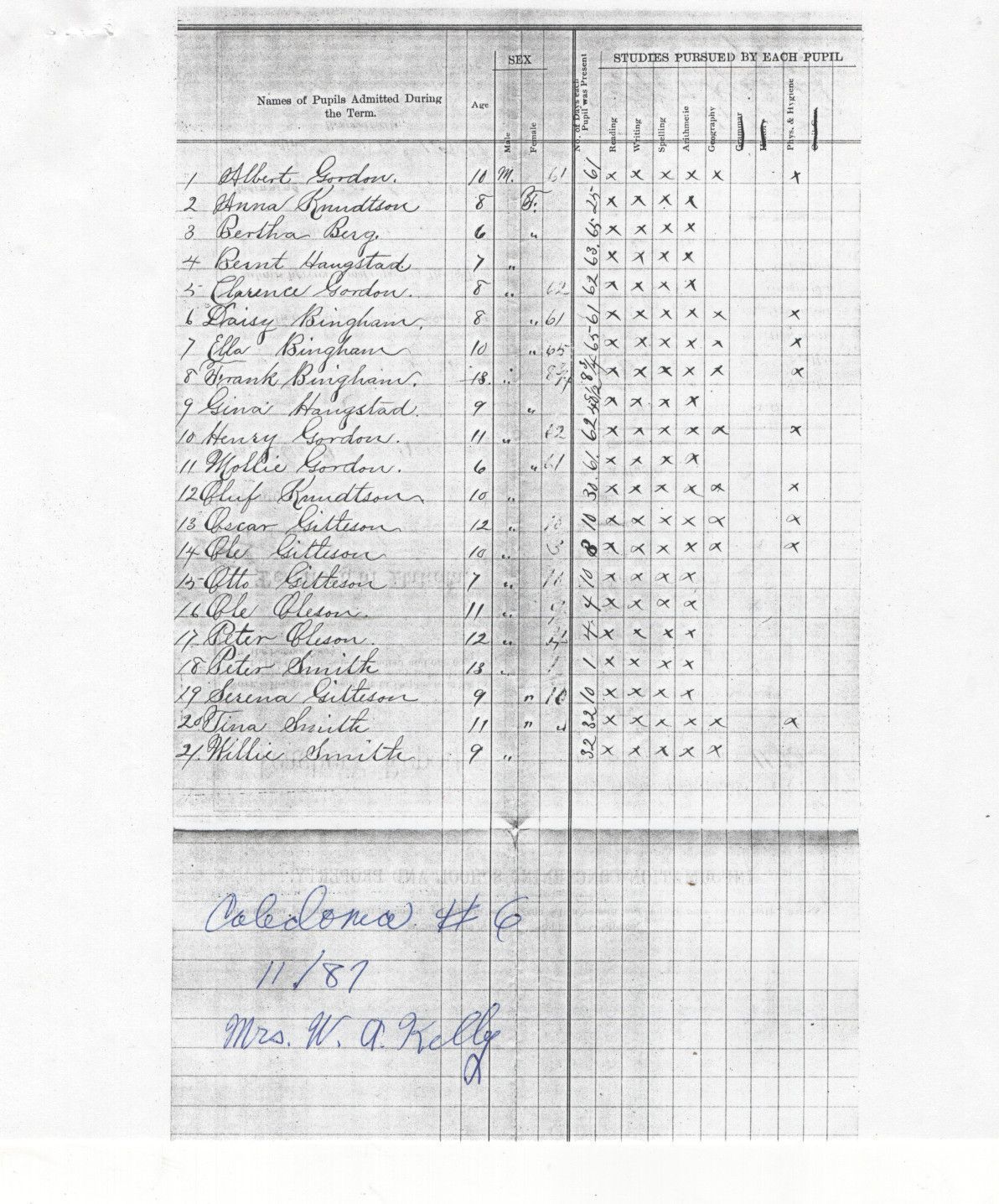 In November 1887, Caledonia School No. 6 teacher Mrs. W. A Kelly reported attendances and studies pursued for 21 students, including Bertha Berg, Daisy Bingham, Ella Bingham, Frank Bingham, Ole Gitleson, Oscar Gitleson, Oscar Gitleson, Serina Gitleson, Albert Gordon, Clarence Gordon, Henry Gordon, Mollie Gordon, Bernt Haugstad, Gina Haugstad, Anna Knudtson, Olaf (Oluf) Knudtson, Ole Oleson, Peter Oleson, Lena Smith, Peter Smith, and Willis Smith.