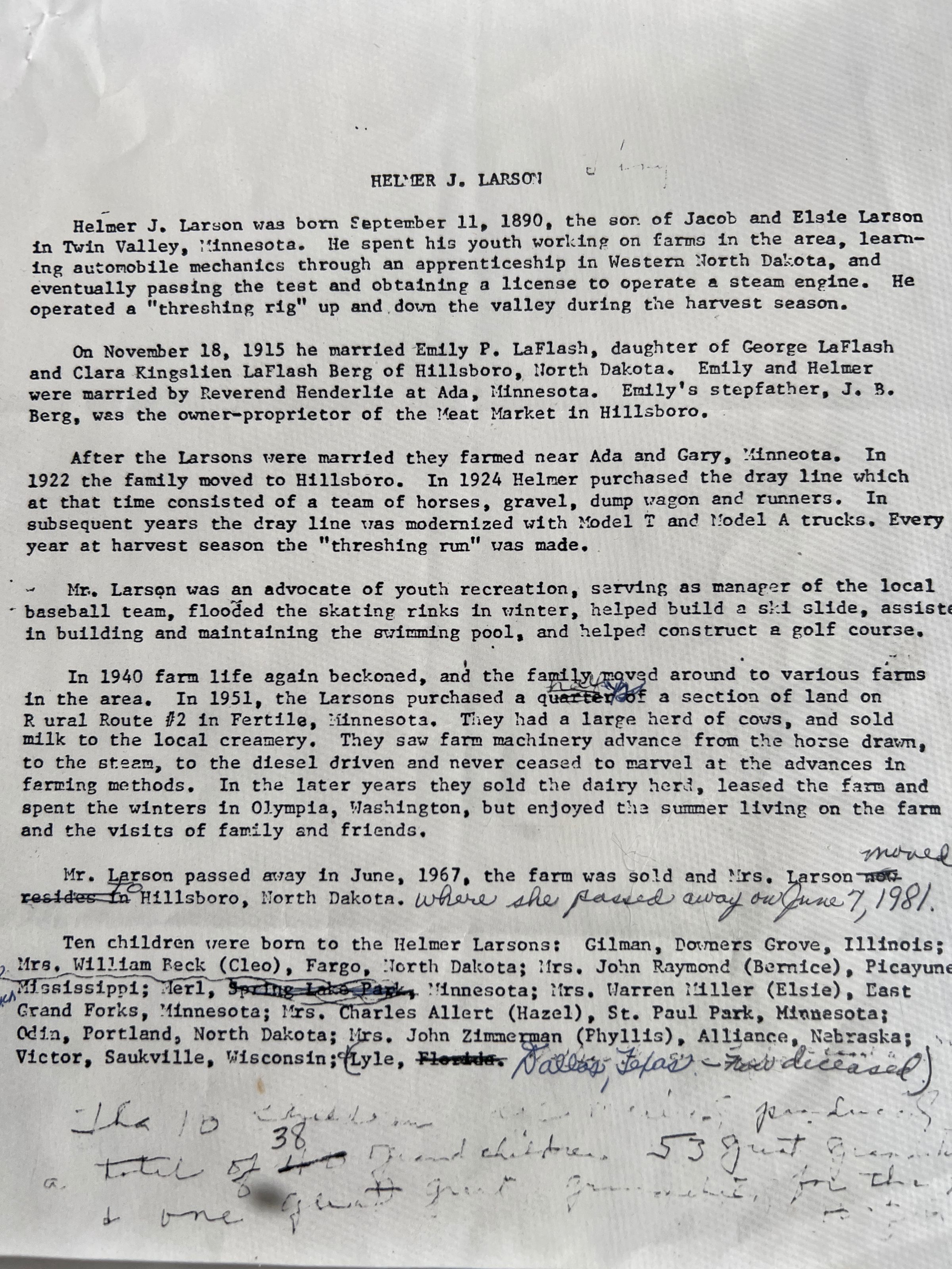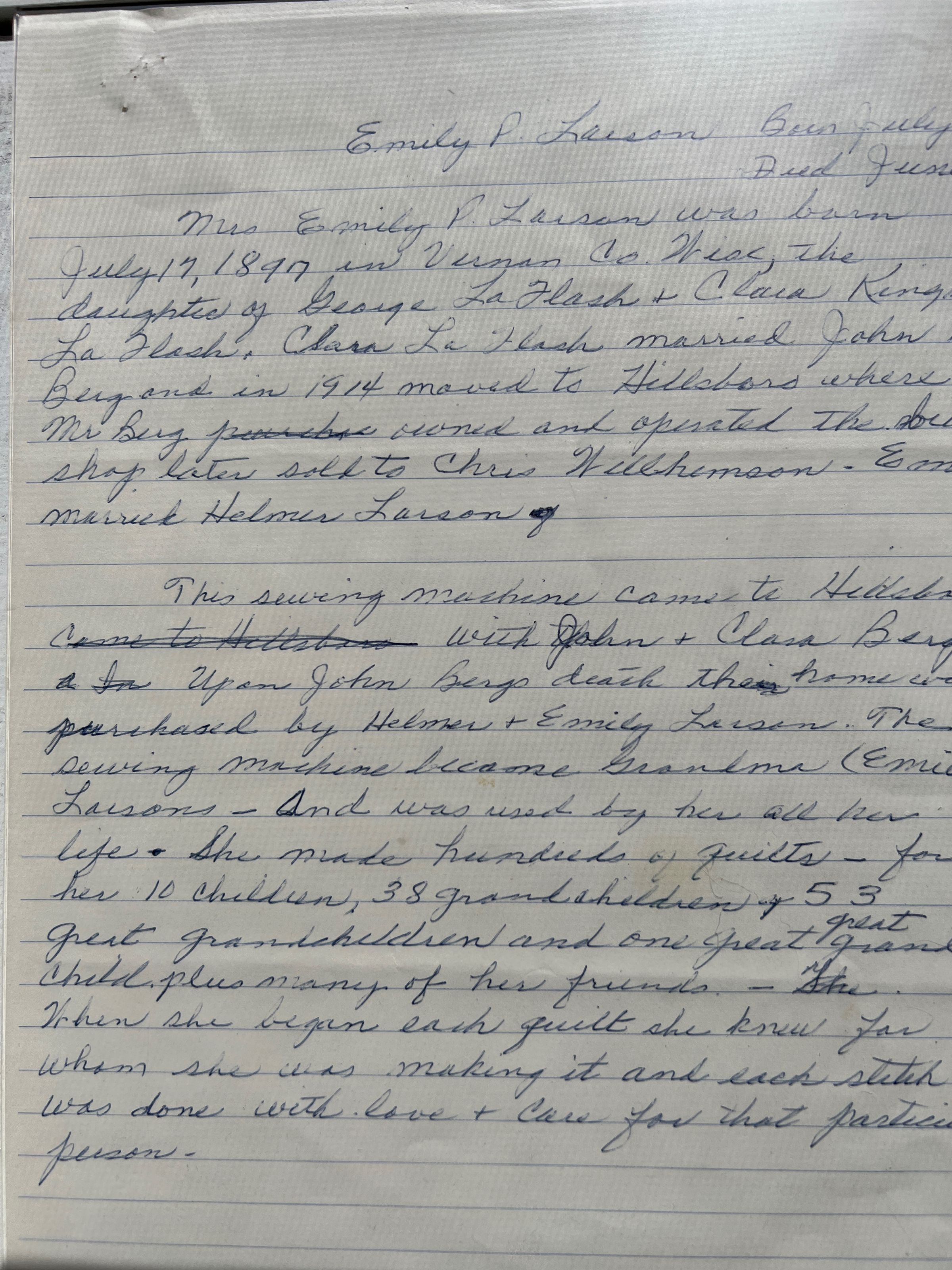 This folder has handwritten information on the life and sewing machine of Emily P. Larsen, wife of Helmer Larson; typed account of Helmer J. Larson's life.Cataloged By
