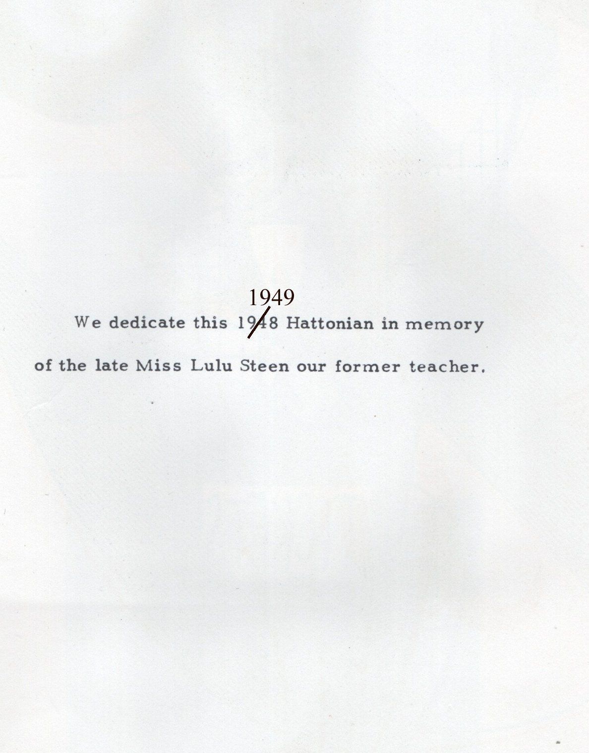 The Class of 1949 Hatton High School Yearbook, titled Hattonian 1949, was dedicated to the memory of Miss Lulu Steen, former teacher.