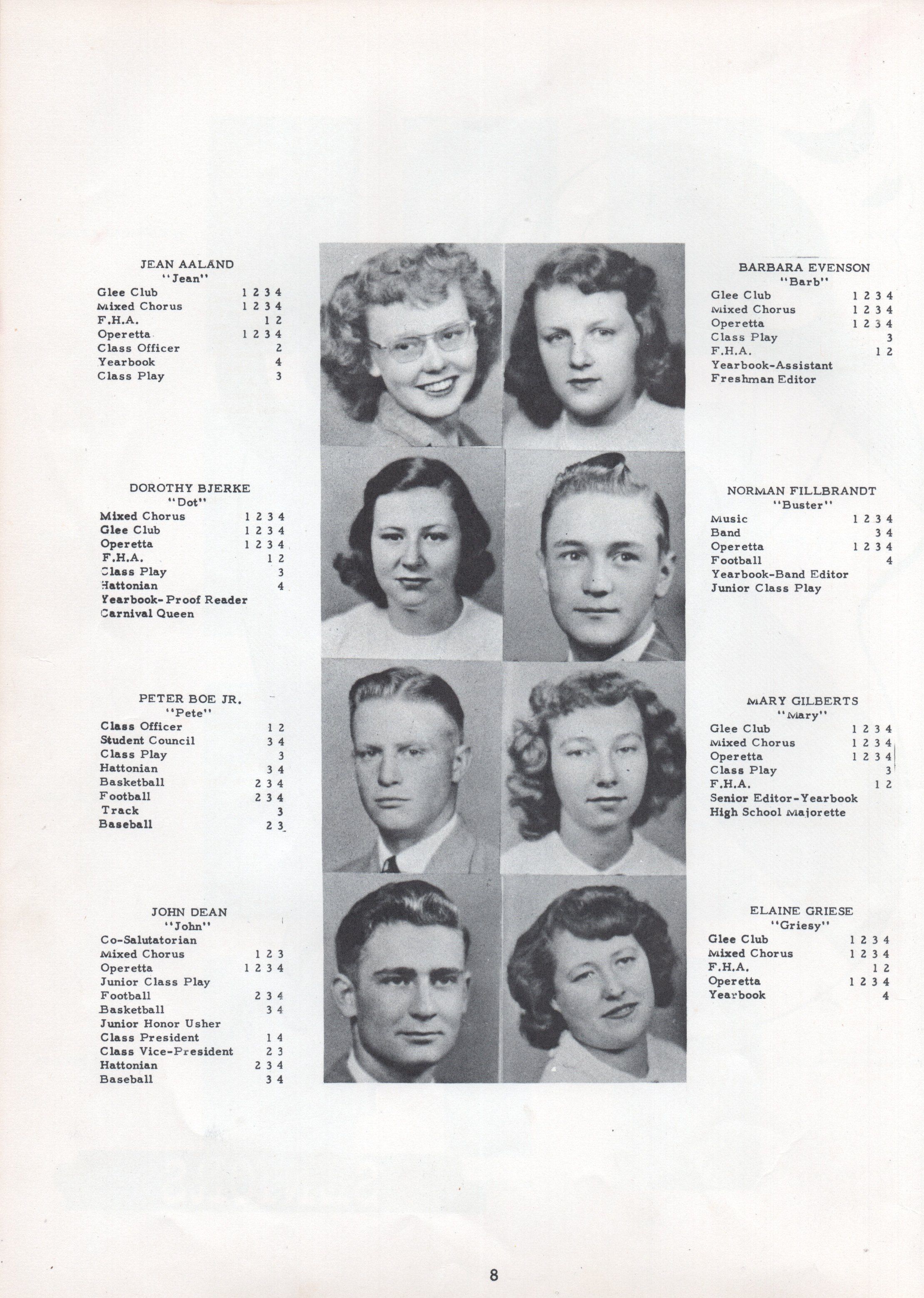 The 1949 yearbook includes four pages of Senior student photographs for: Jean Aaland, John Dean, Dorothy Bjerke, Peter Boe Jr., Barbara Evenson, Norman Fillbrandt, Mary Ann Gilberts, Elaine Griese, Ruth Gronhovd, Eileen Hanson, Delores Karlstad, Eileen Knalson, Joan Melby, Keith Nelson, Ruth Offerdahl, Robert Olson, Lorraine Ostmo, LeRoy Peterson, Lorraine Sanda, Beverly Savage, Selma Yvonne Severson, Lois Soliah, Donald Stevning, Jean Sylvester, Carrol Swenson, Arlan Teie, Curtiselle Thompson, Dorothy Weeks, and LaVerne Wastvedt. Not pictured: Betty Bjerke, Joyce Huus, and Fern Tollefson.