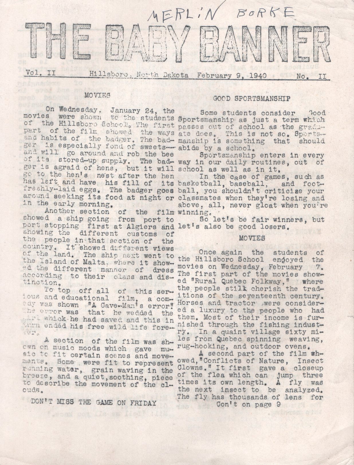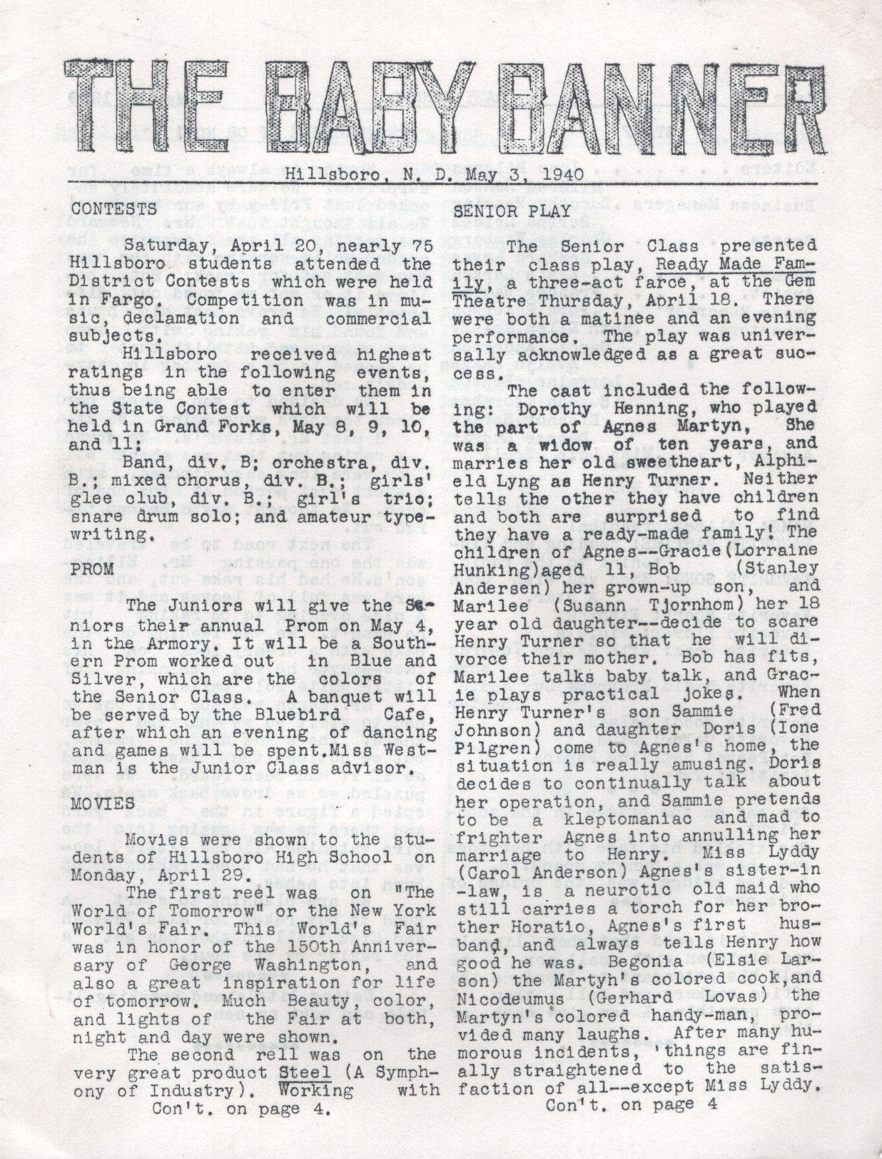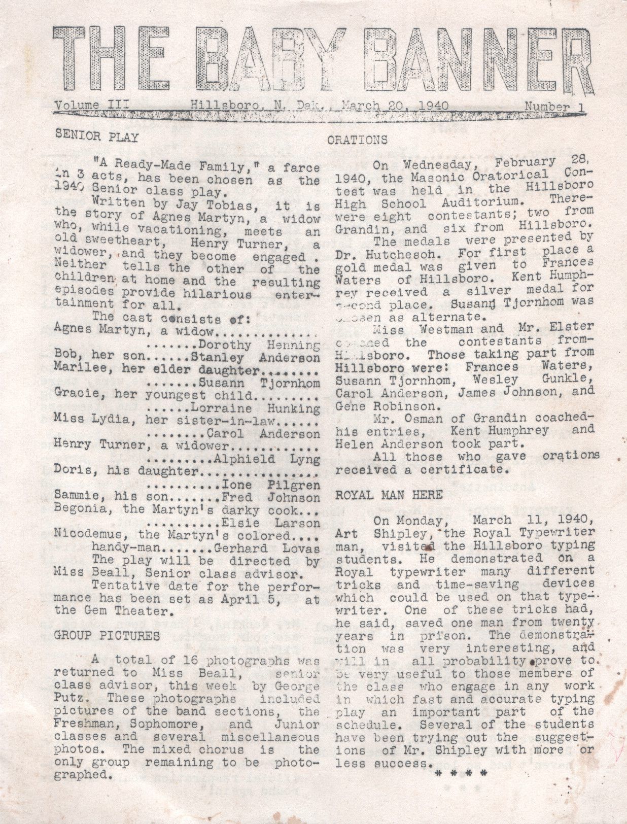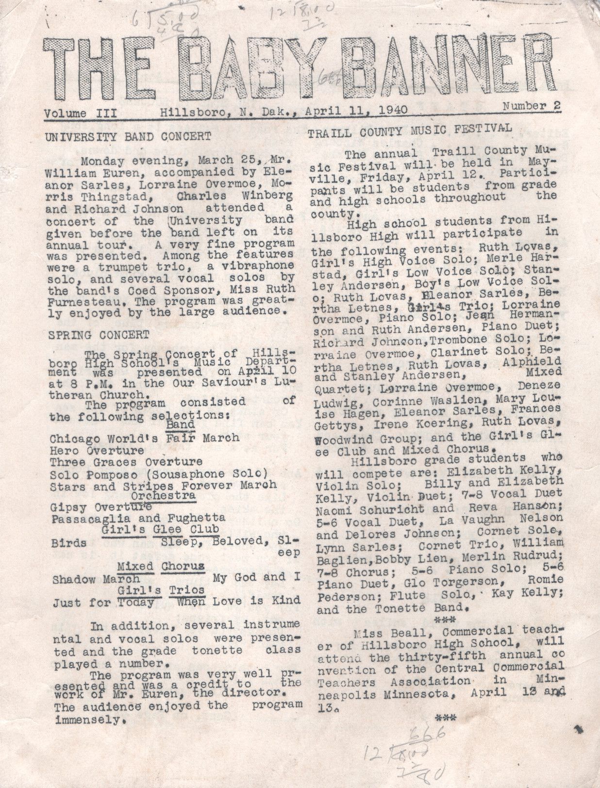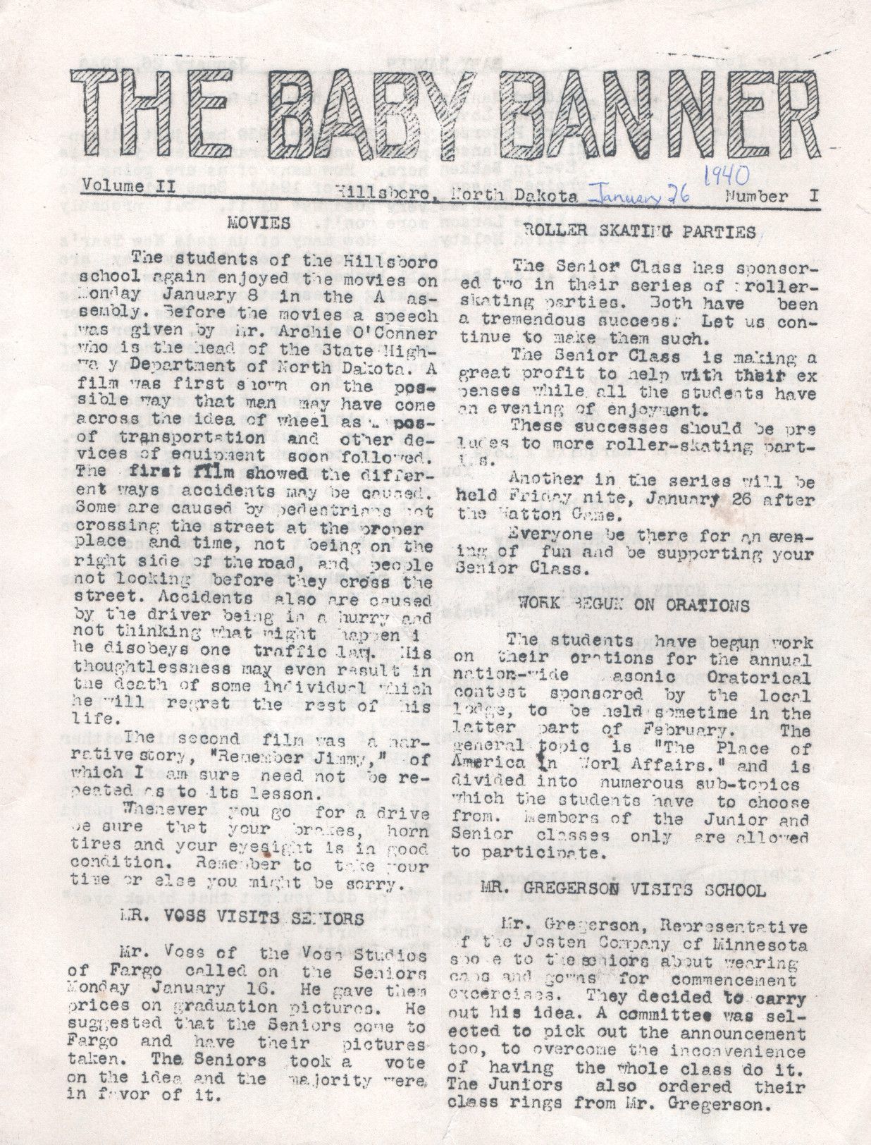 In 1940, from January to May, the Hillsboro High School students published a newspaper titled "The Baby Banner". The newspaper staff included Mildred Hanson and Ione Pilgren, Editors; Gerhard Lovas and Bob Winberg, Sports; Fern Peterson and Frances Waters, Business Managers; and Reporters Carol Anderson, Evelyn Bakken, Lorraine Benson, Merle Harstad, Dorothy Henning, Elsie Larson, Bertha Letnes, Deneze Ludwig, Ruth Melsby, Eleanor Sarles and Susann Tjornhom.