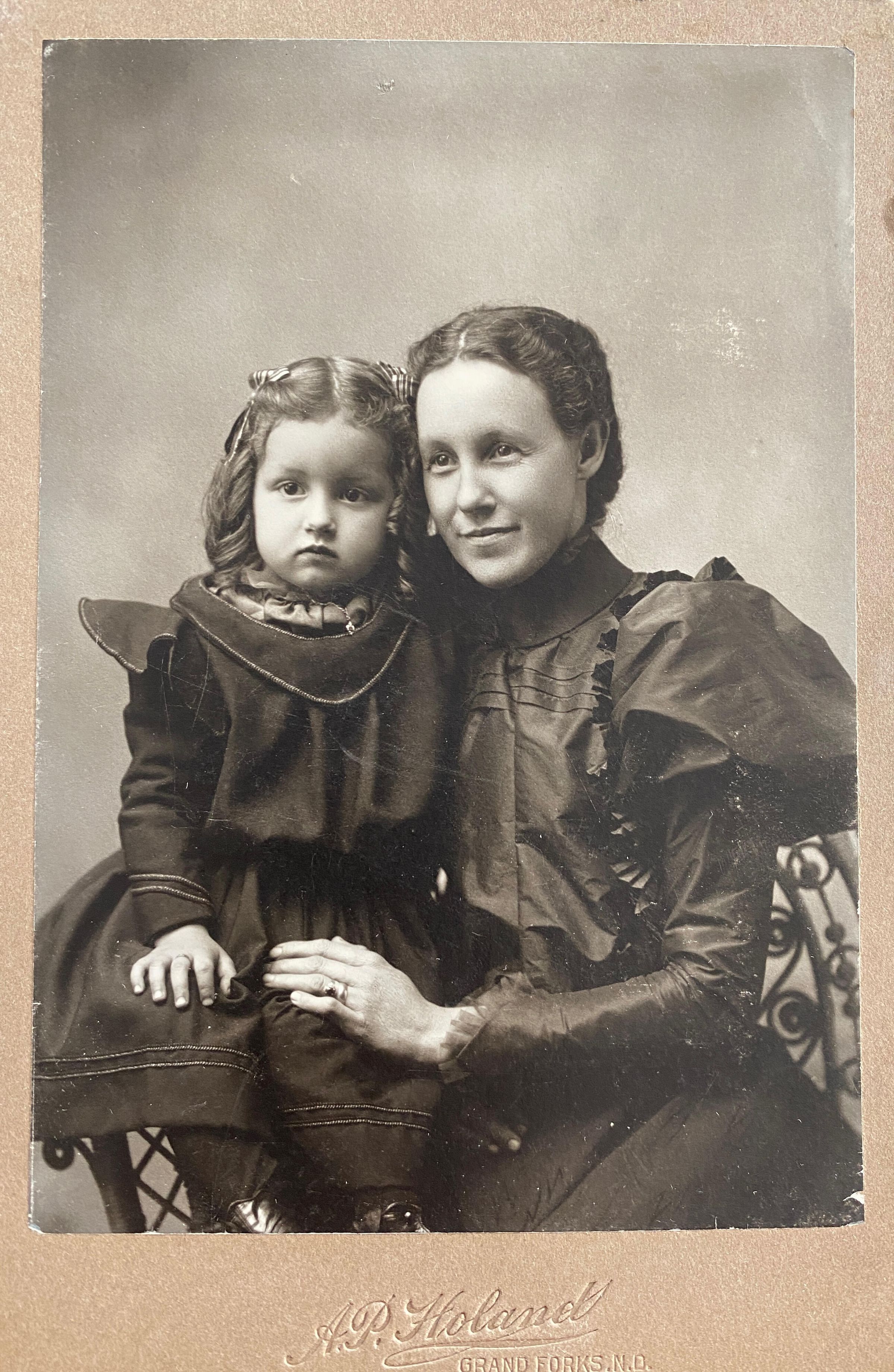 An A. P. Holland Studio of Grand Forks photograph of Mrs. Jens (Louisa Grimsrud) Figenskau & daughter Alpha Lorinda Figenskau, who were friends of Ostina Hovet of Hillsboro, ND [see Catalogit entry 2024.499.1]. For more information on Jens and Louisa Figenskau's life, see entry 2025.7.1.