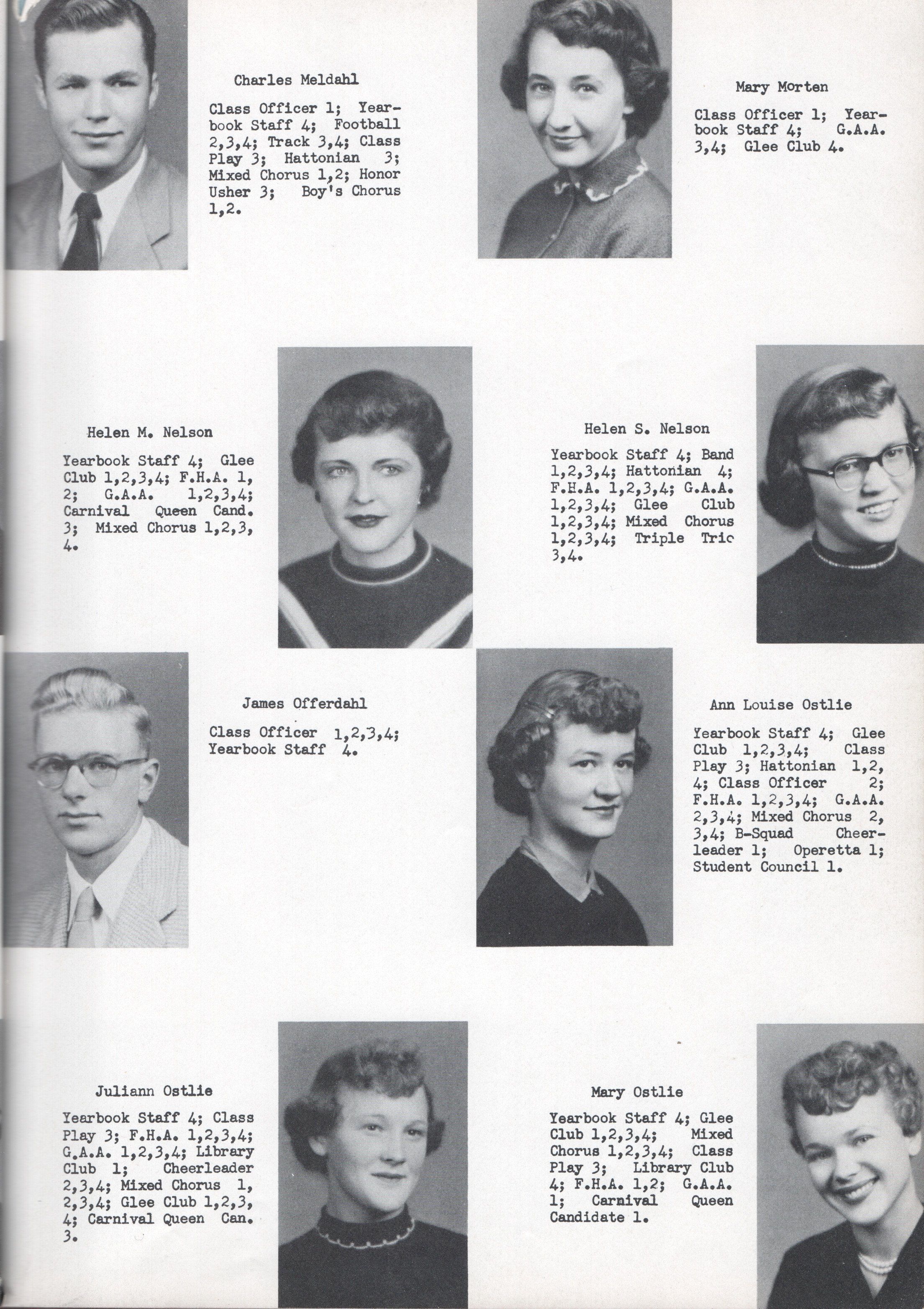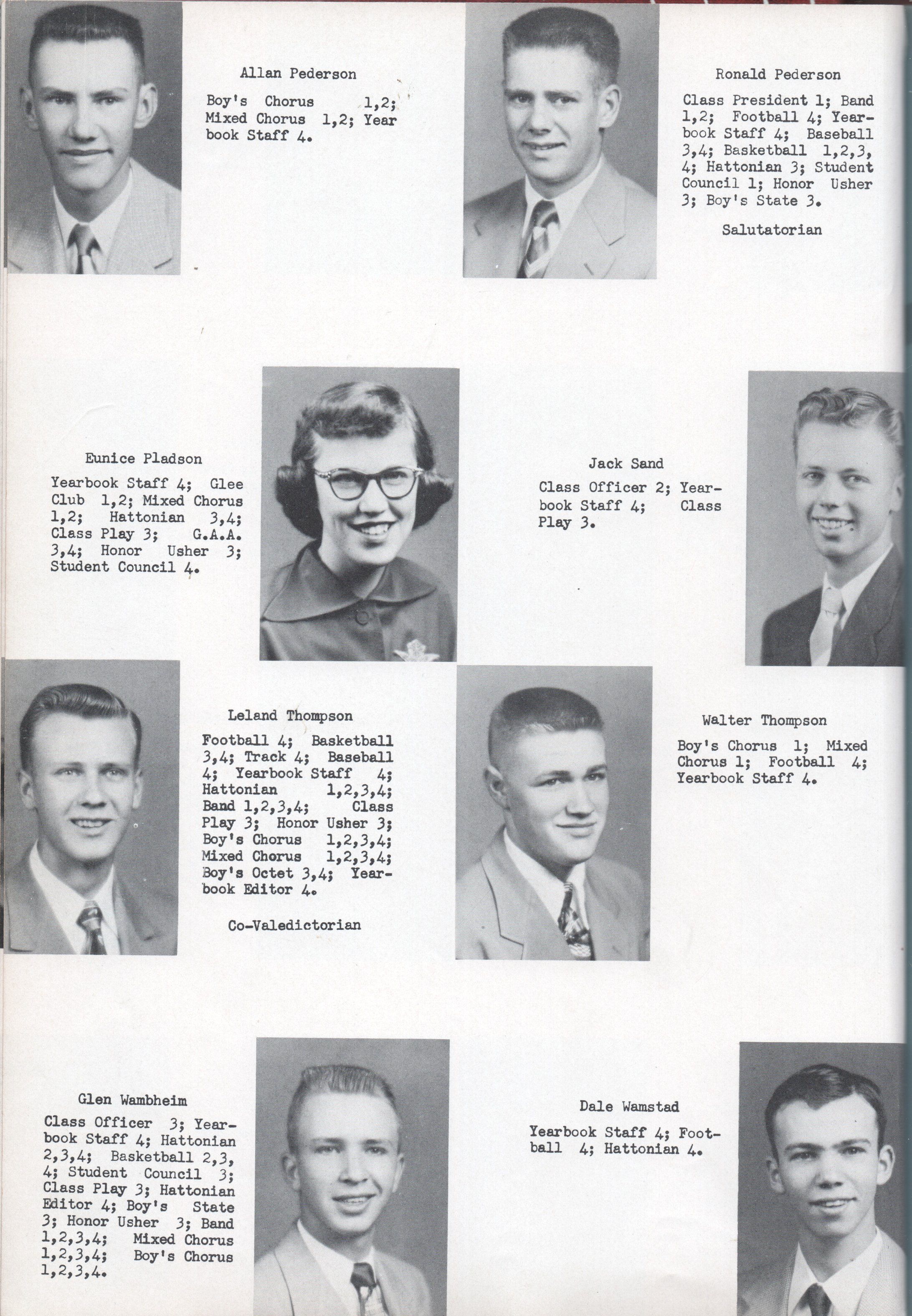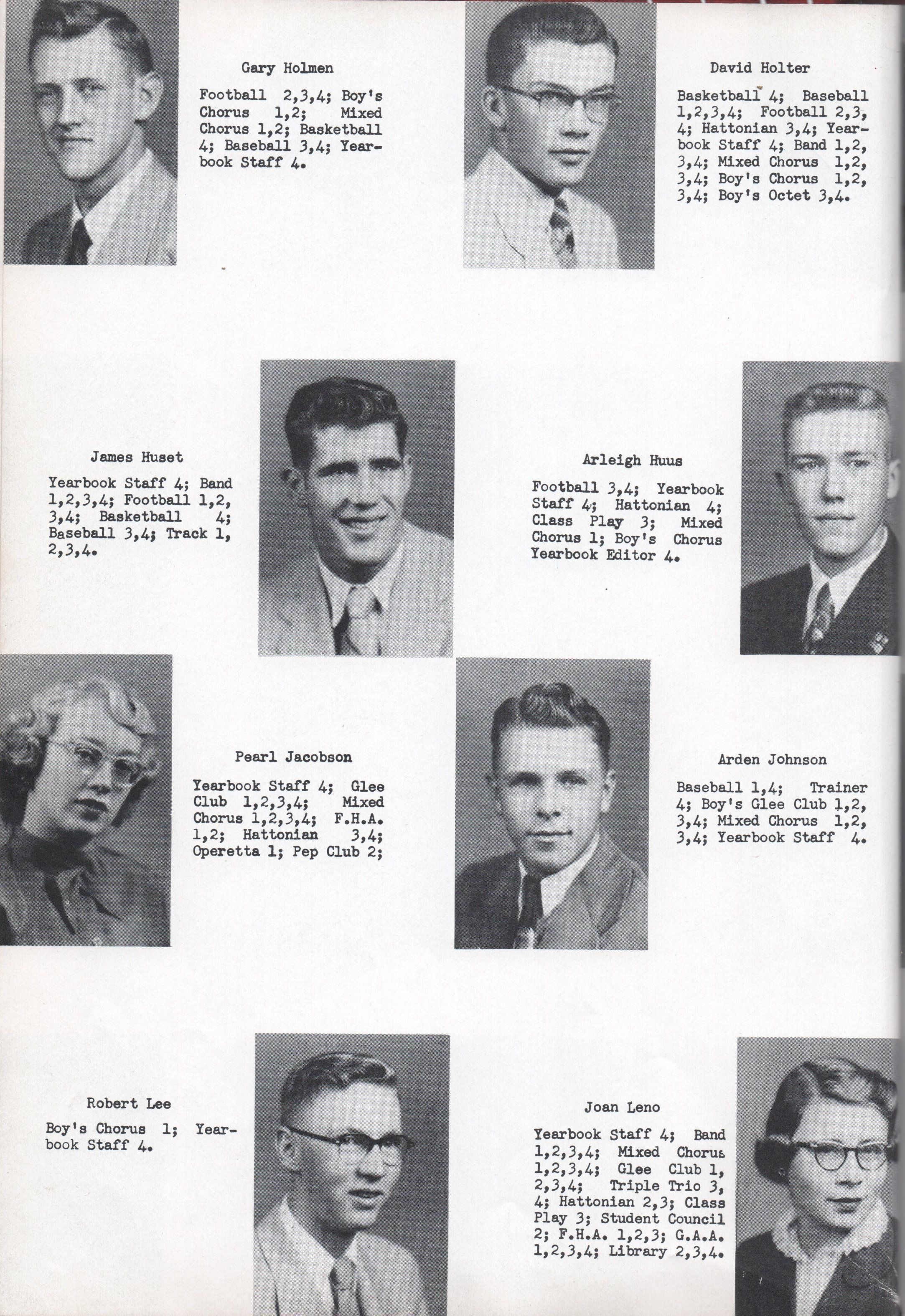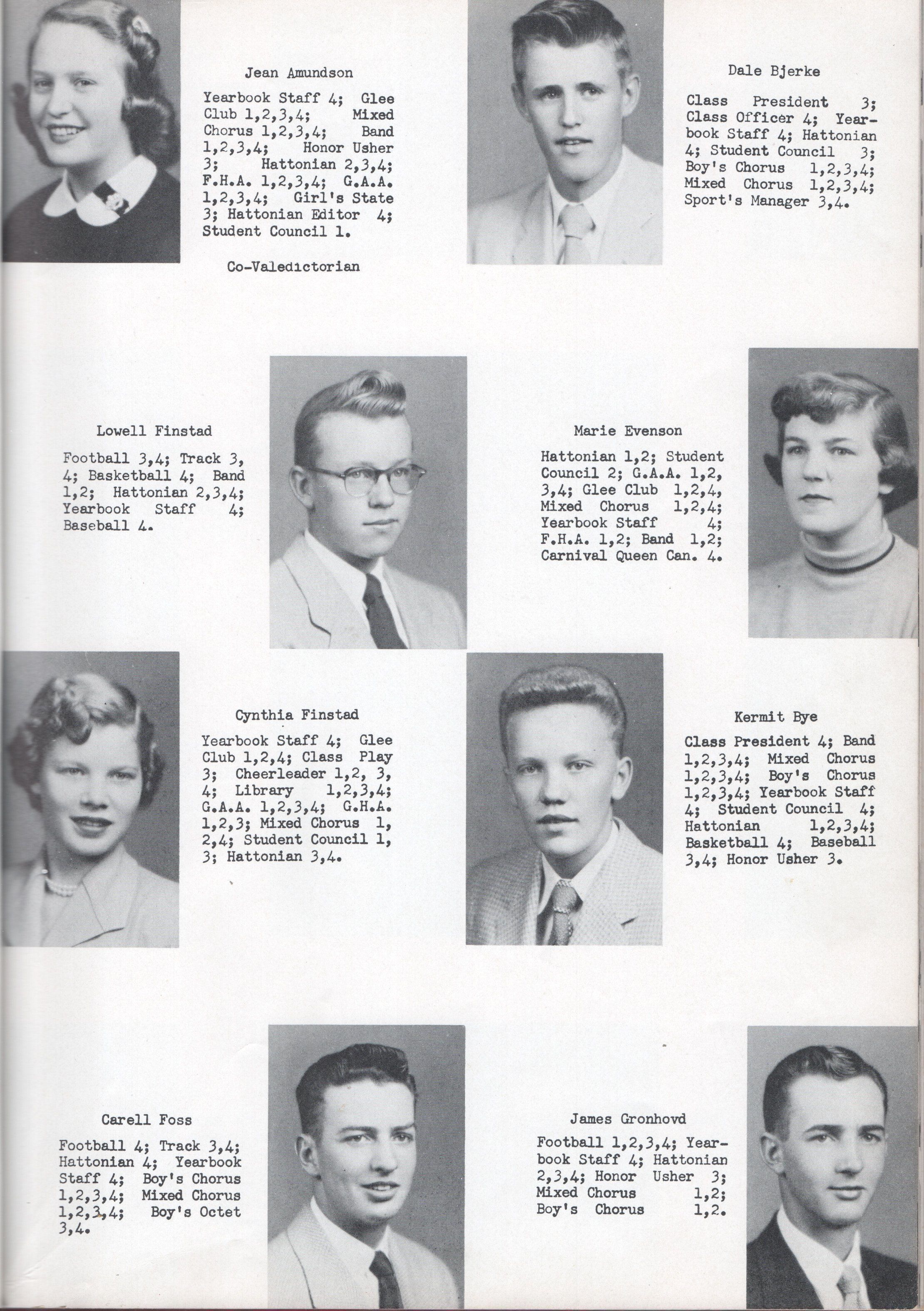 The 1954 yearbook includes four pages of Senior student photographs for: Jean Amundson, Dale Bjerke, Kermit Bye, Marie Evenson, Cynthia Finstad, Lowell Finstad, Carell Foss, James Gronhovd, Gary Holmen, David Holter, Arleigh Huus, James Huset, Pearl Jacobson, Arden Johnson, Robert Lee, Joan Leno, Charles Meldahl, Mary Morten, Helen M. Nelson, Helen S. Nelson, James Offerdahl, Ann Louise Ostlie, Juliann Ostlie, Mary Ostlie, Allan Pederson, Ronald Pederson, Eunice Pladson, John 'Jack' Sand, Leland Thompson, Walter Thompson, Glen Wambheim, and Dale Wamstad.