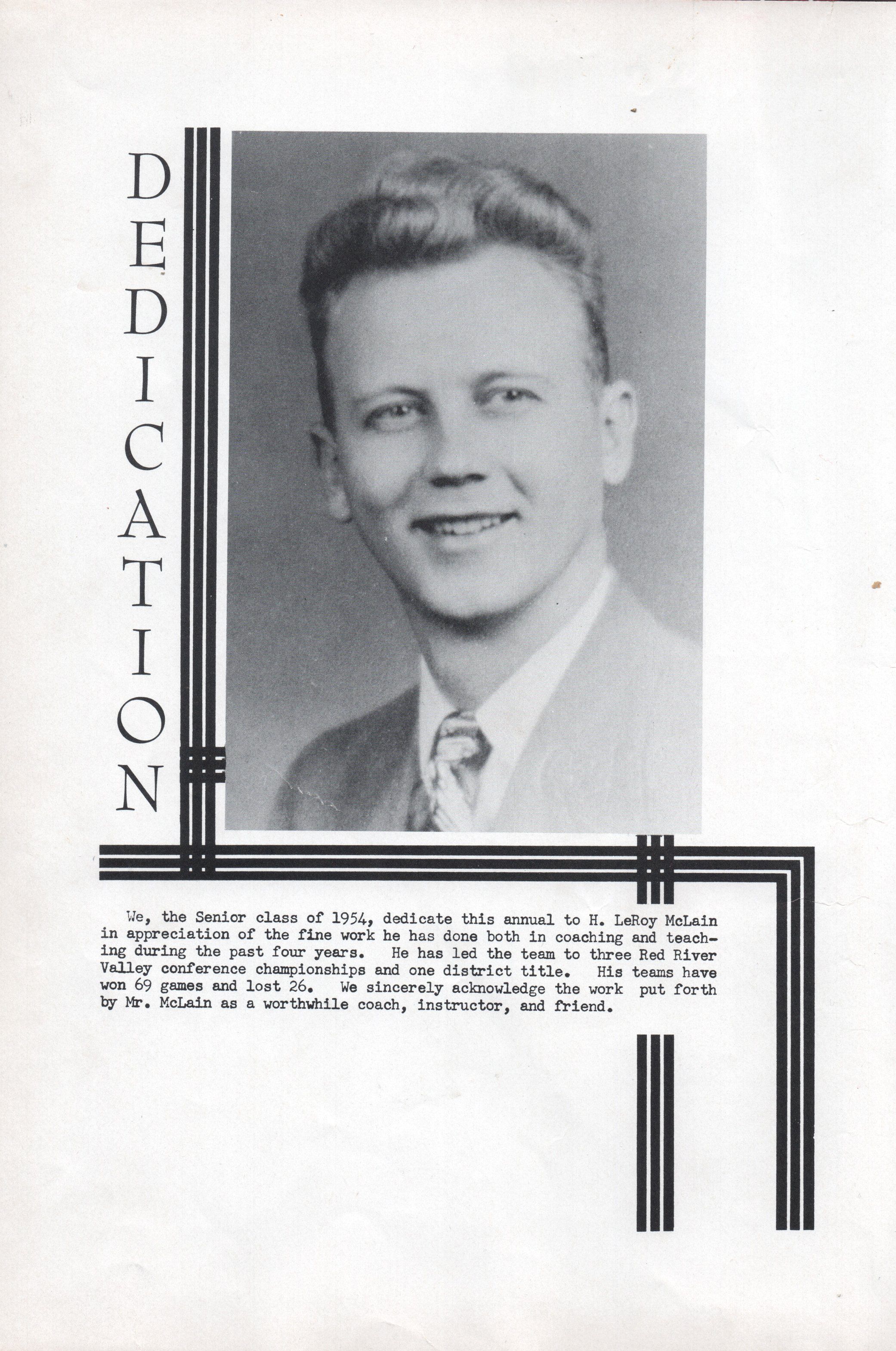 The Class of 1954 Hatton High School Yearbook, titled Hattonian 1954, was dedicated to Mr. H. LeRoy McLean, coach & teacher.