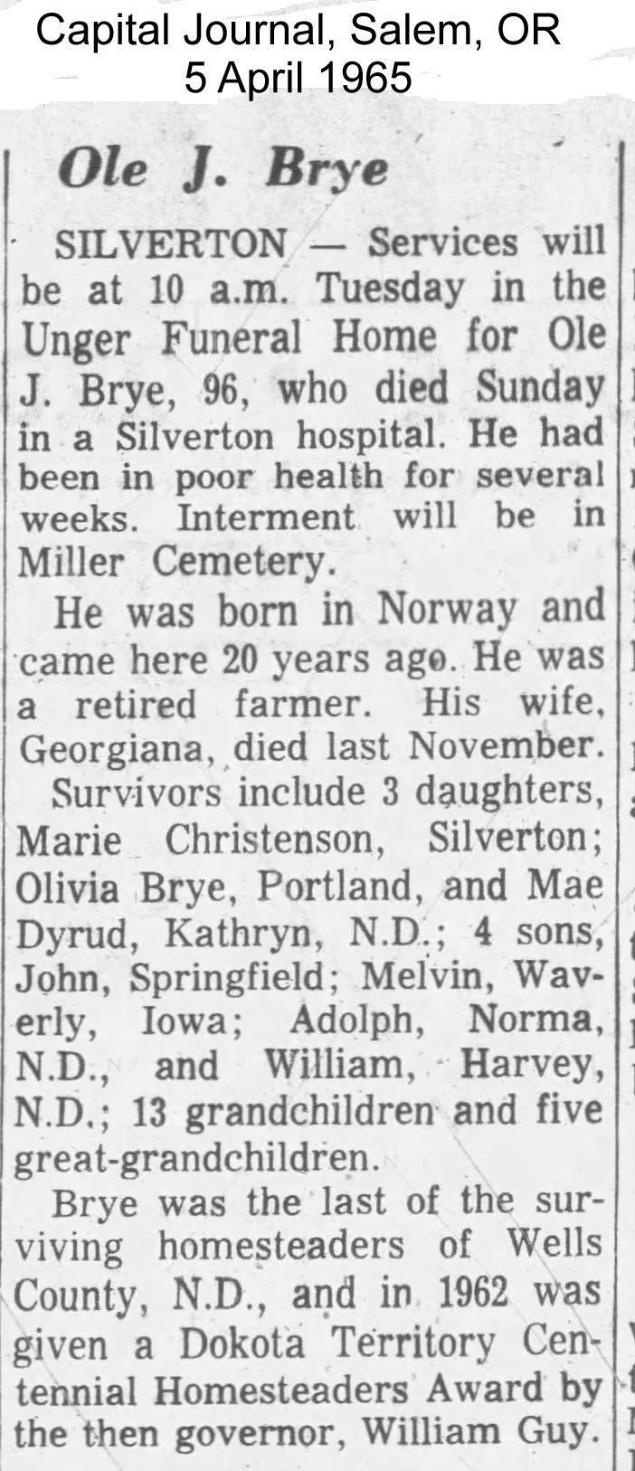 The donation card (Number AP II 257) describes the photo as "Man's hat on person--picture kitty-corner". On the back of this photo is written "Cousin Georgine Bry Harvey". We know that a Georgiana Frovig married Ole Brye on 27 October 1898, and they farmed near Harvey in Wells County, ND [1910 & 1920 US Census data]. By 1920, Ole and Georgine Brye had eight children. When Ole passed away, age 96, in April 1965 in Silverton, Oregon, his obituary (below) noted that Ole and Georgine's son William lived in Harvey, ND.