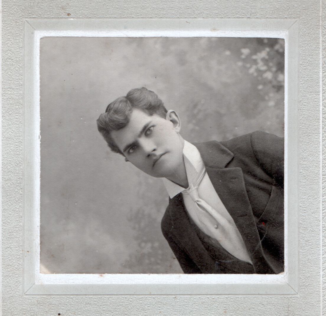 A second photograph (below) of a young man was paired with the "Man's hat on Person" photograph. The style and framing of both photographs are very similar. The second photo was taken at C. E. Fuller studio in Northwood, ND, hence, the "Man's hat on Person" photograph was also likely taken at Northwood prior to 1900 when Photographer C. E. Fuller moved his studio to Hillsboro, ND.Acquisition