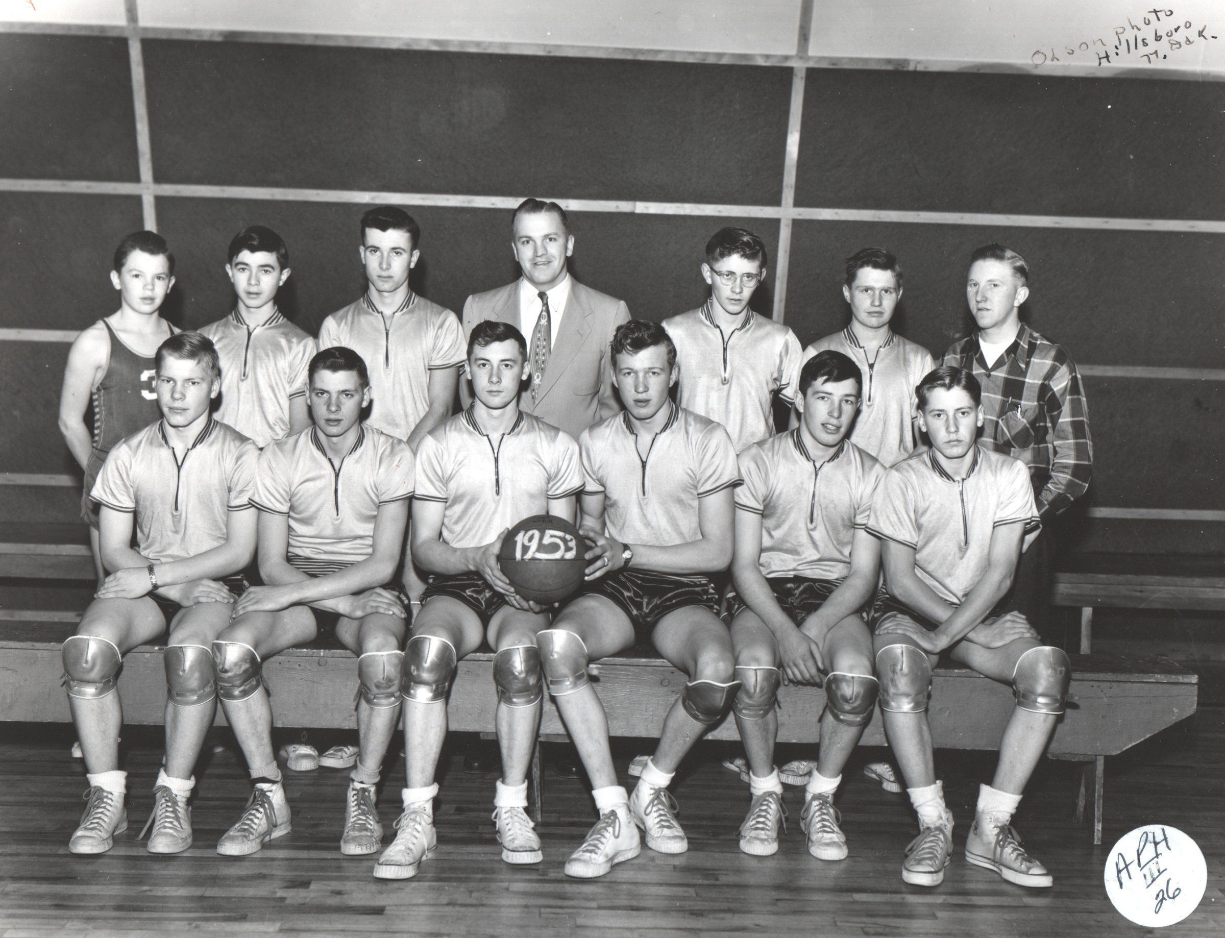 This photograph of the 1952-53 Caledonia High School boy's basketball team was taken by Olson Photo, Hillsboro, Traill County, ND. Team members included, front, left-to-right: Keith Anderson, Lawrence 'Junior' Doeden, Gene Cotton, Ernest Soholt, Raymond Soholt, and Roger Anderson; back, left-to-right: Paul Beltz, Don Hatfield, James Vettel, Coach M. A. Ulland, Dennis Satermo, Roger Wright, and Manager Harold McDonald.