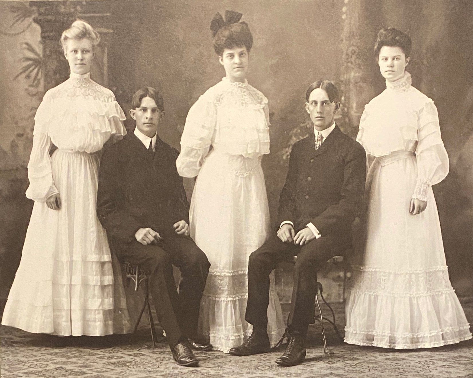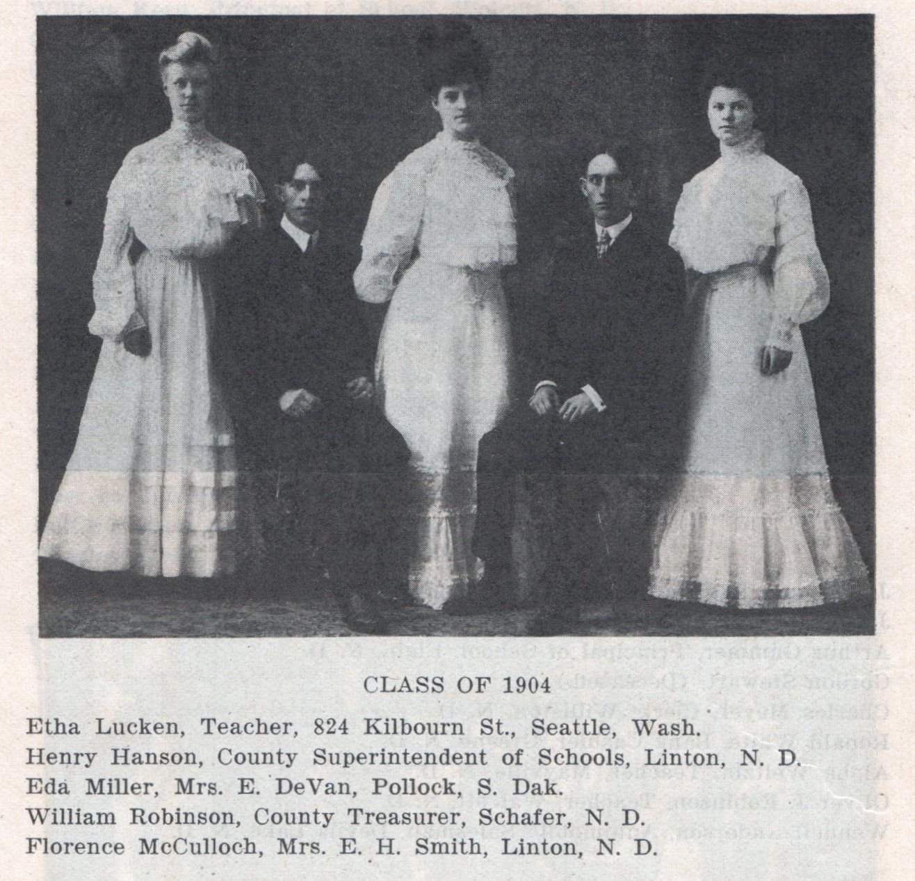 In 1904, the first graduating class of Mayville High School included five students (l-r): Etha Lucken, Henry Hanson, Eda Miller, William Robinson, and Florence McCulloch.