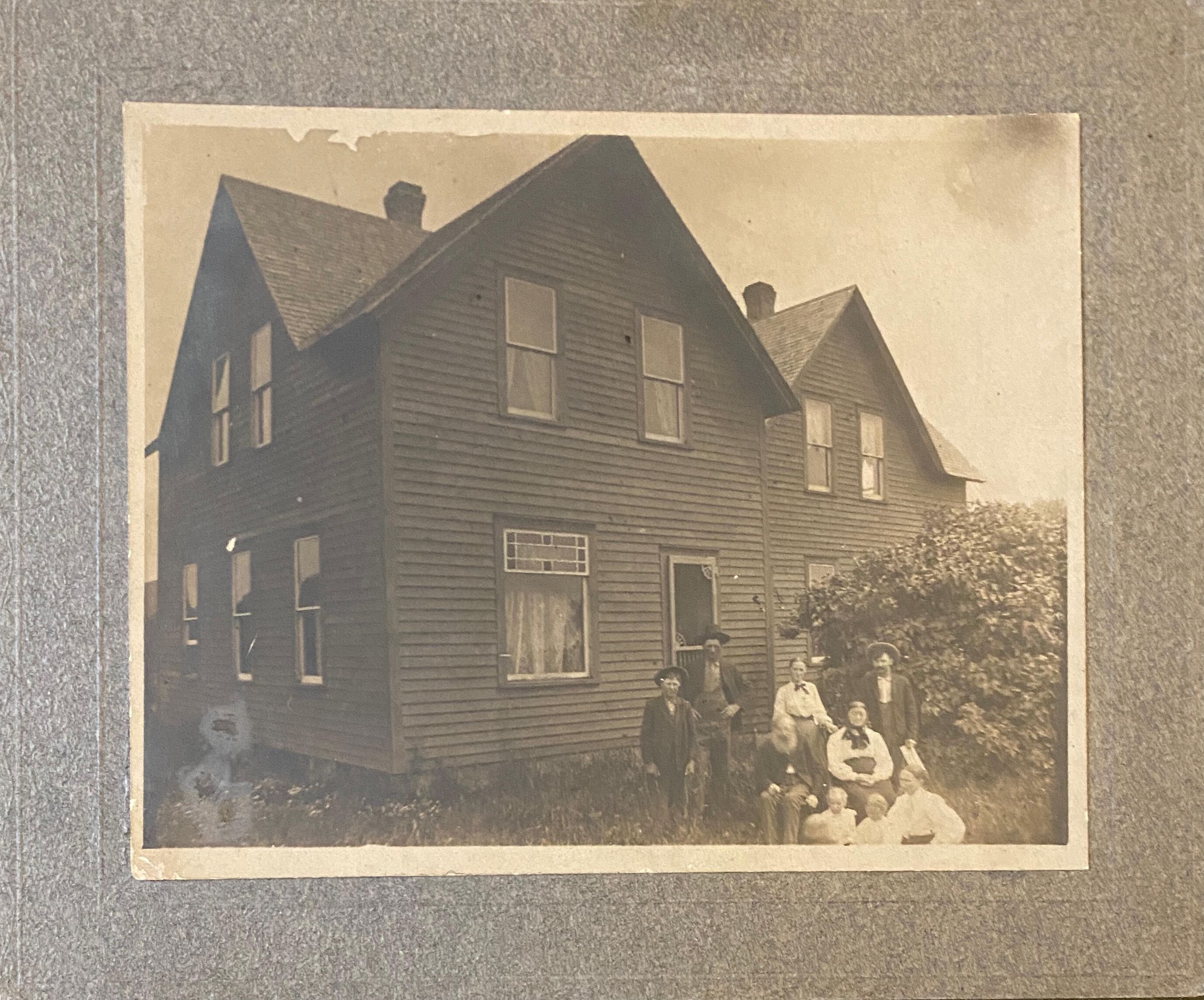 Rognstad in Wisconsin written on back. Family in front of home.