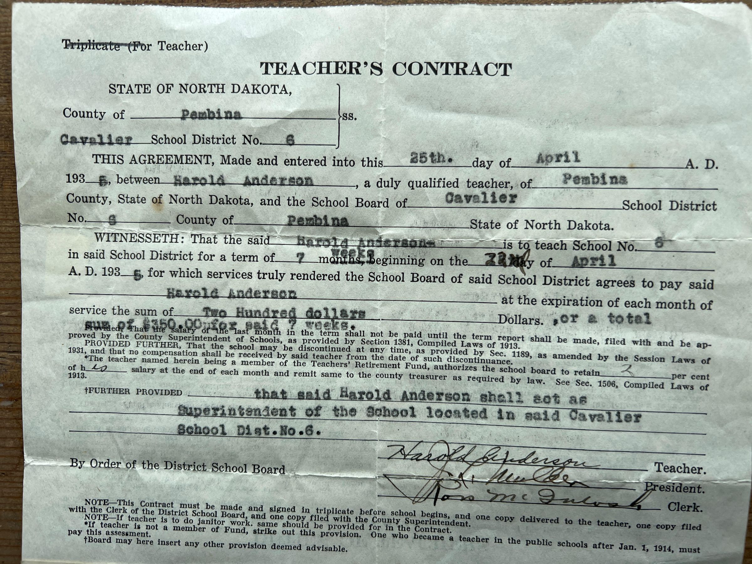 This file contains a collection of documents on Harold Anderson, such as a teacher's Contract for Cavalier, ND. The file also includes articles in the Hillsboro Banner about Harold as told by his wife, Bea Anderson. Harold was originally from Galesburg, ND, and he and Bea operated grocery businesses in Hillsboro, including Anderson's IGA, and the Fairway Store.Cataloged By