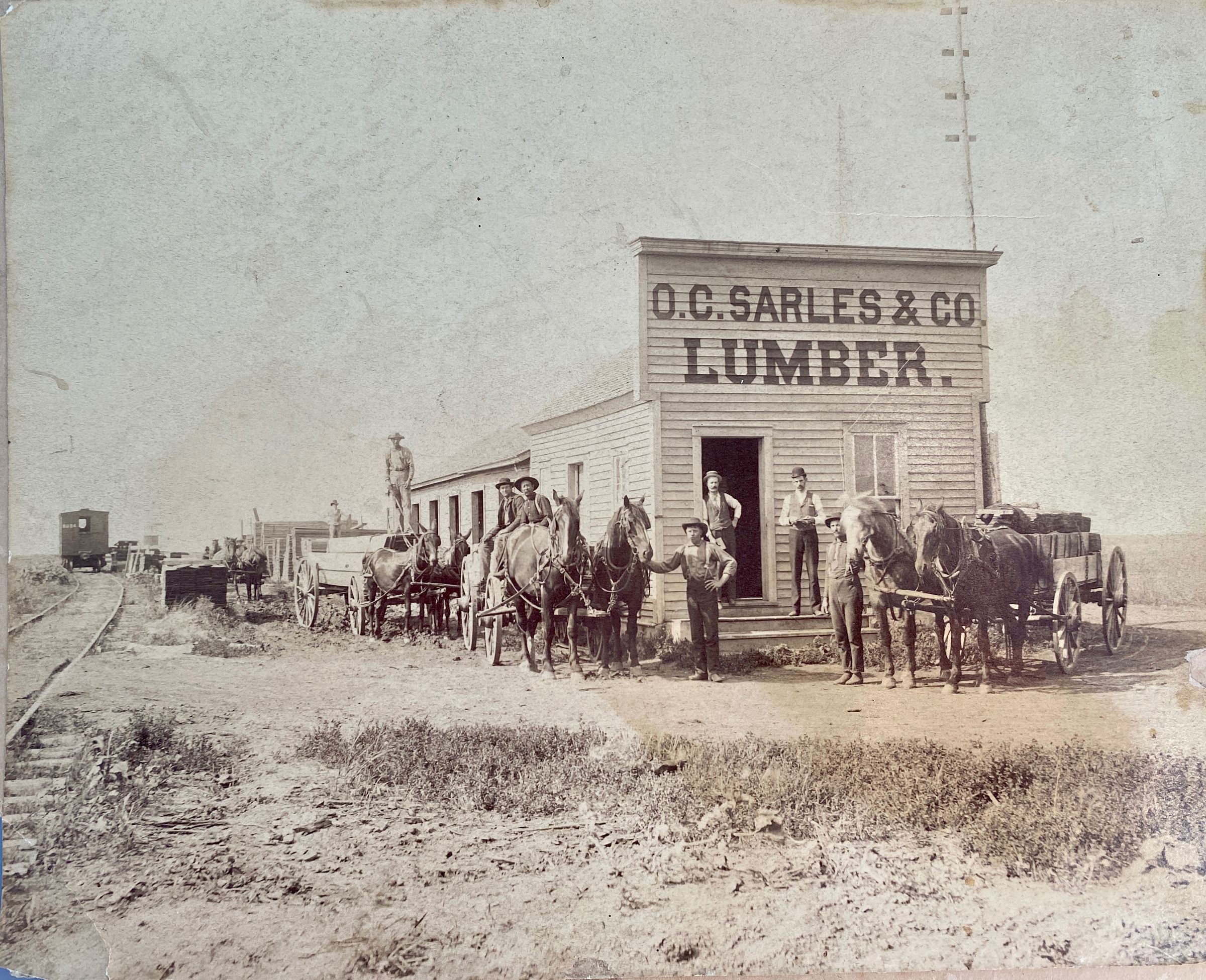 O. C. Sarles & Co. Lumber in the very early days of Hillsboro. Note the lack of other buildings and trees in the landscape.Cataloged By