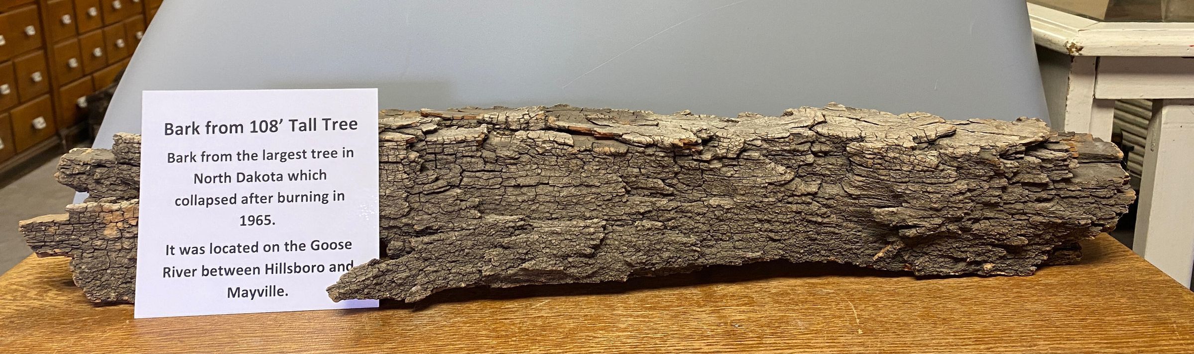 Bark from 108’ Tall Tree in Traill County which was once the largest tree in North Dakota. It was located along the Goose River between Hillsboro and Mayville. The tree collapsed after burning in 1965.Cataloged By
