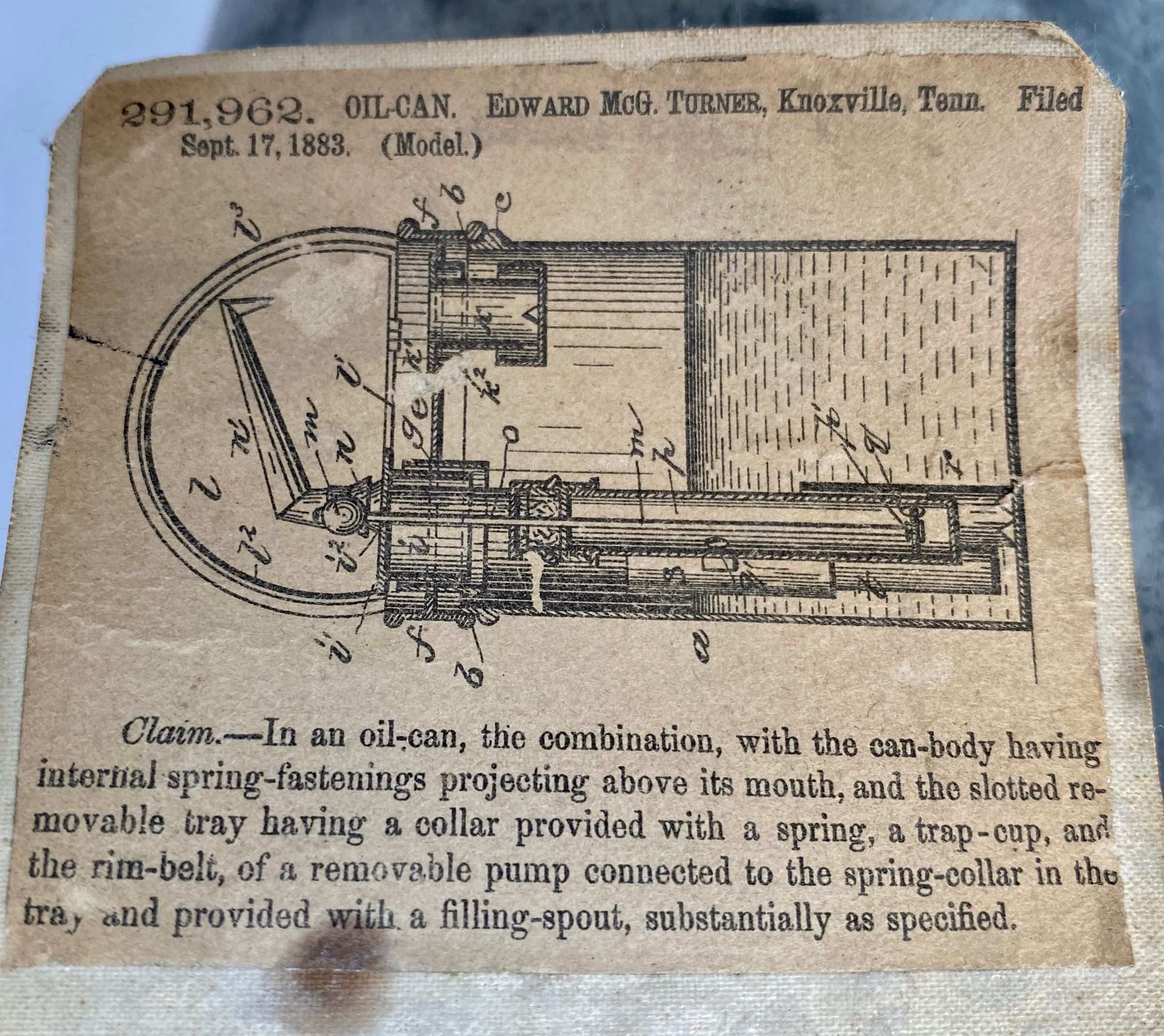 Patent No. 291,962 - Oil Can - 1883 made by E. M. TurnerCataloged By