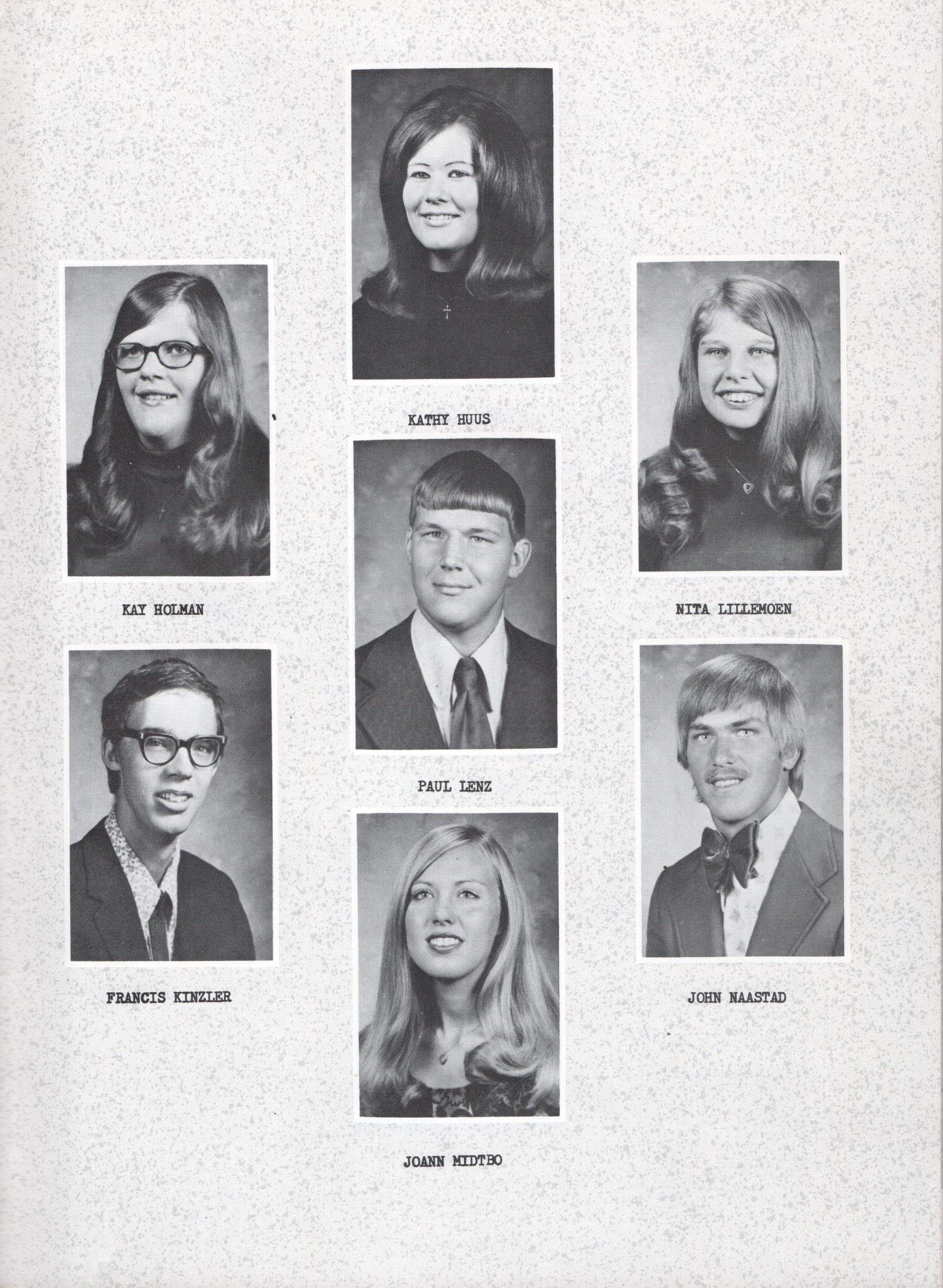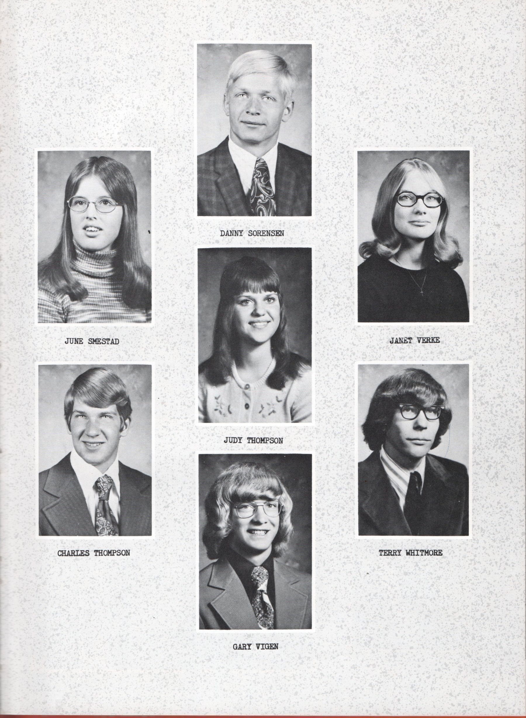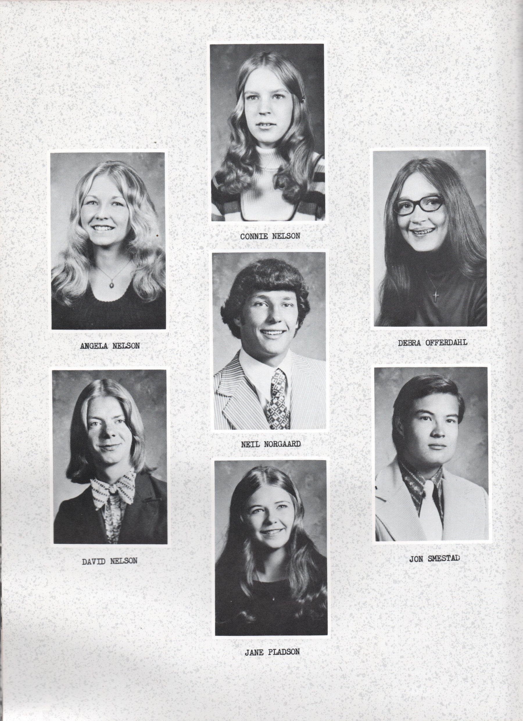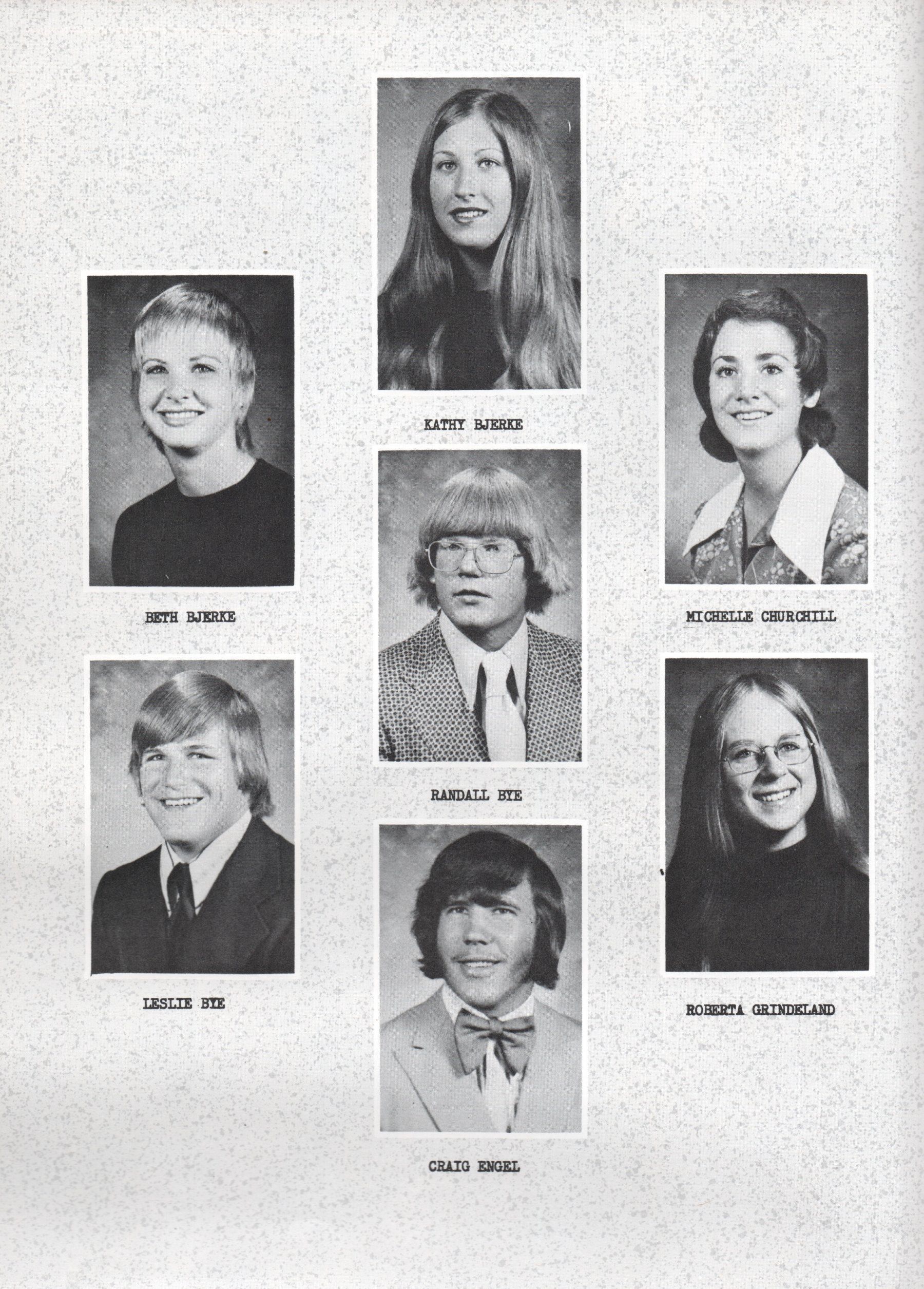 The 1974 yearbook includes five pages of Senior student photographs for: Beth Bjerke, Kathy Bjerke, Leslie Bye, Randall Bye, Michelle Churchill, Craig Engel, Roberta Grindeland, Kay Holman, Kathy Huus, Francis Kinzler, Paul Lenz, Nita Lillemoen, JoAnn Midtbo, John Naastad, Angela Nelson, Connie Nelson, David Nelson, Neil Norgaard, Debra Offerdahl, Jane Pladson, Jon Smestad, June Smestad, Daniel Sorensen, Charles Thompson, Judy Thompson, Janet Verke, Gary Vigen, and Terry Whitmore.