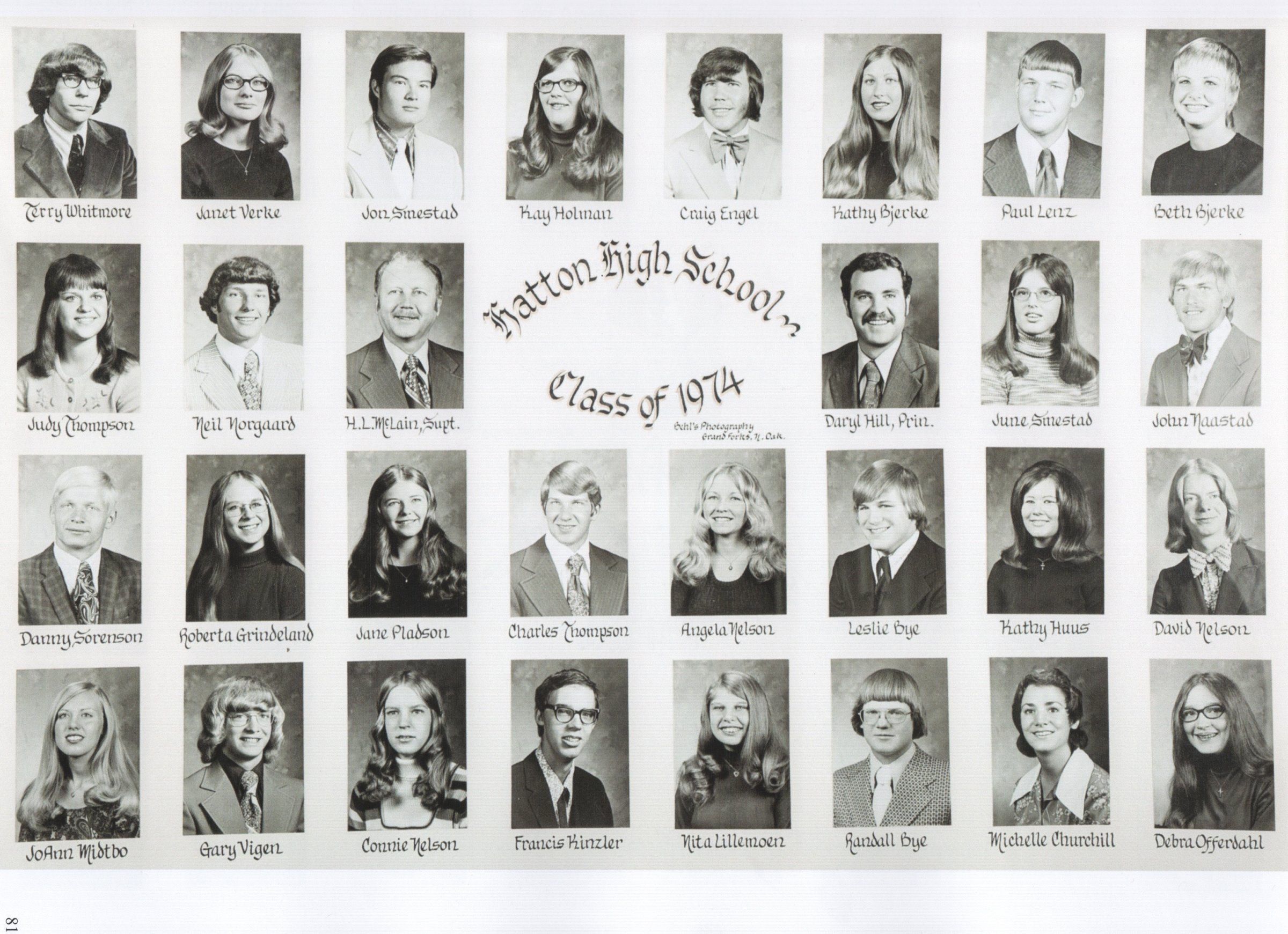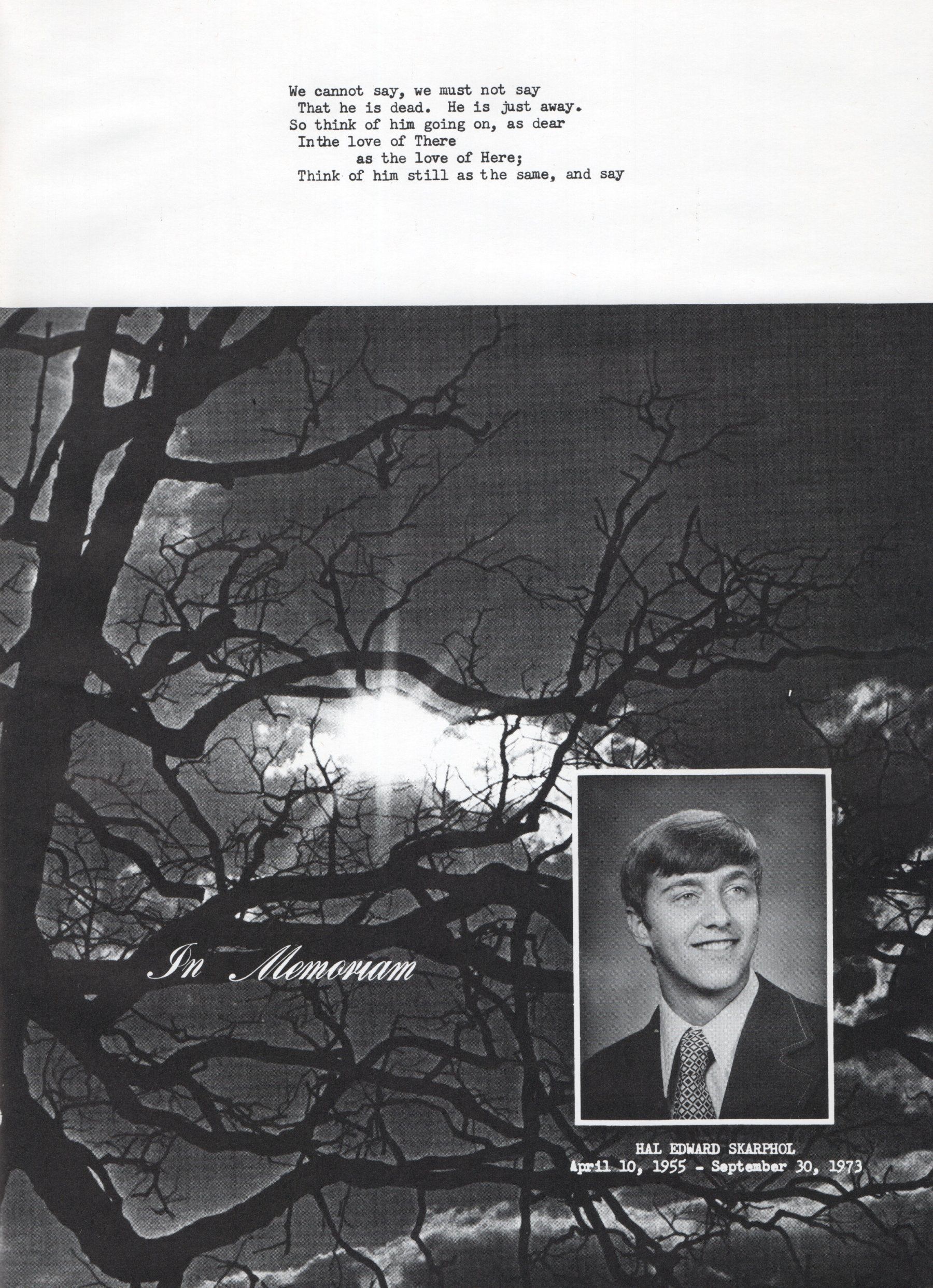 The Class of 1974 Hatton High School Yearbook, titled 74 Hattonian, was dedicated to the memory of Hal Skarphol, Class of 1973.