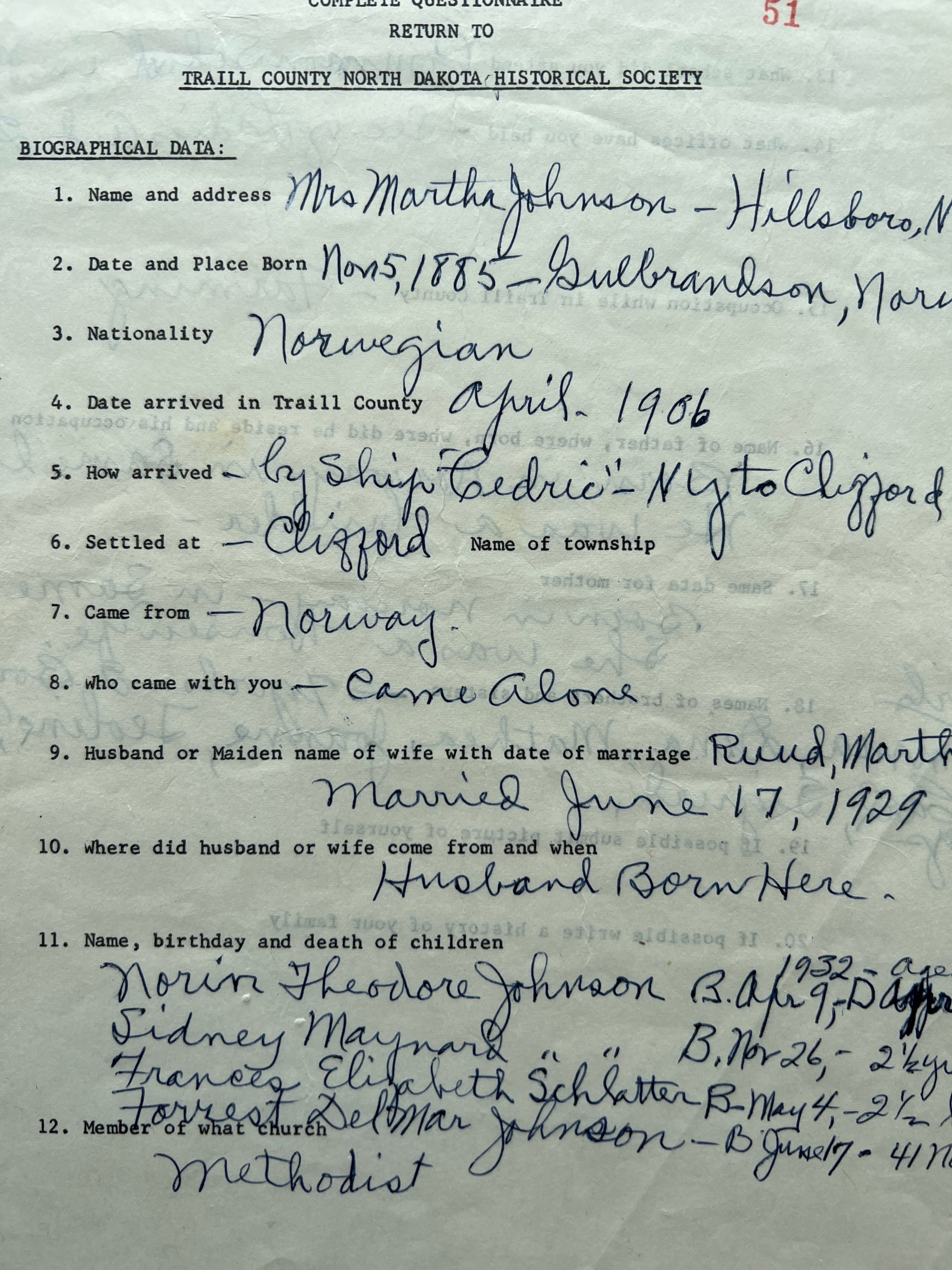This file has a two-page questionnaire completed by Mrs. Martha (Ruud) Johnson of Clifford. Martha had four children, including Norin Johnson (born 9 April 1932), Sidney Johnson (b. 26 November 1934), Frances Johnson (b. 4 May 1937, m. Mr. Schlatter), and Forrest Johnson (b. 17 June 1941).Cataloged By
