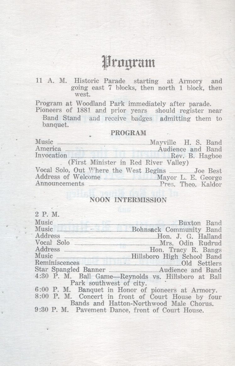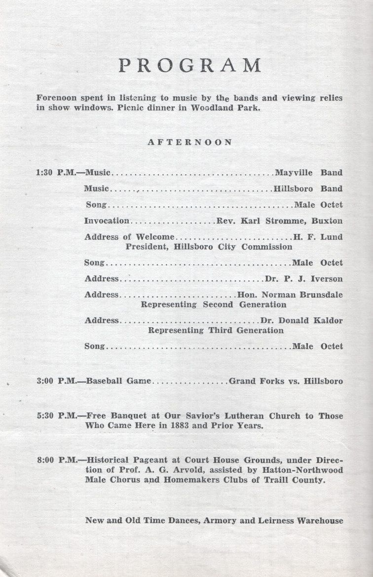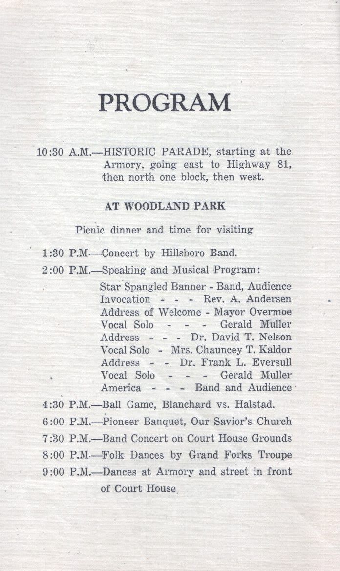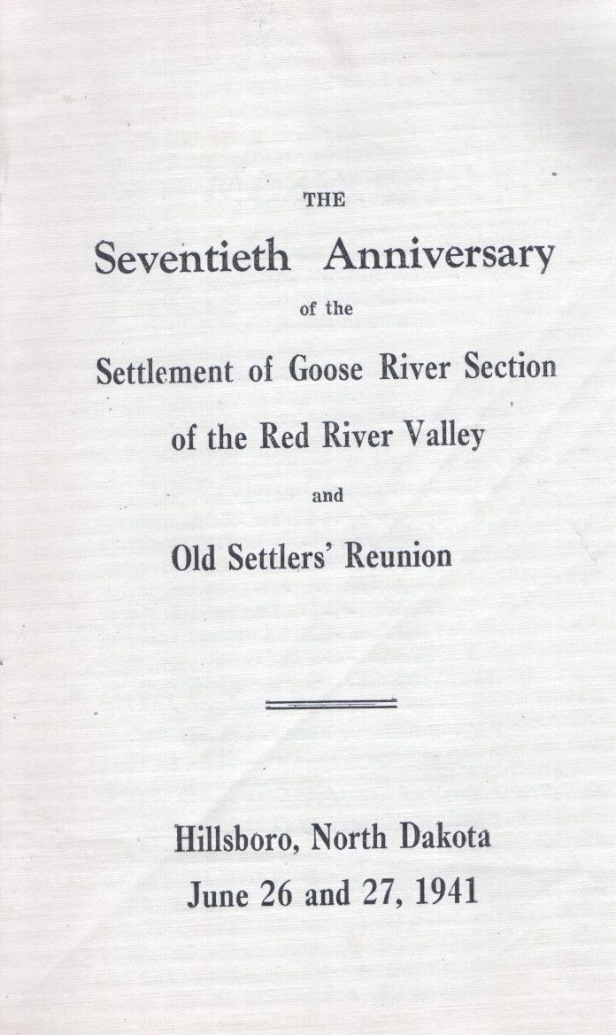 (3) the Program for the Seventieth Anniversary of the Settlement of the Goose River Section of the Red River Valley and an Old Settlers' Reunion held in Hillsboro, ND, on 26-27 June 1941, which includes the names of 1871 Pioneers still living (see below); and