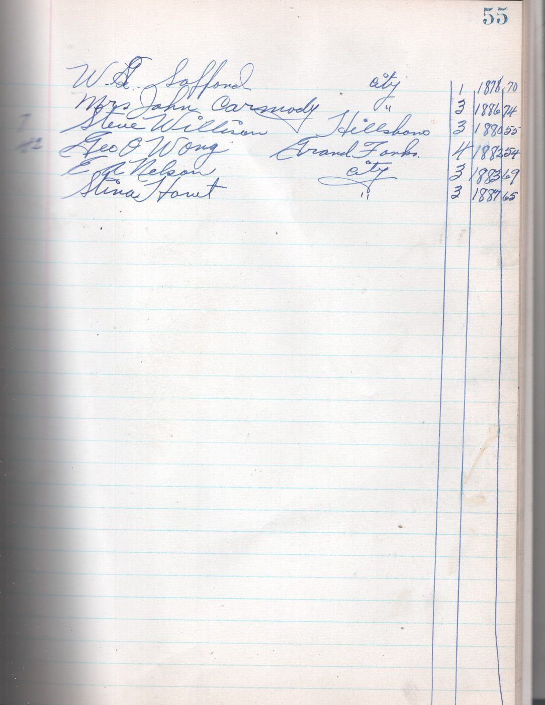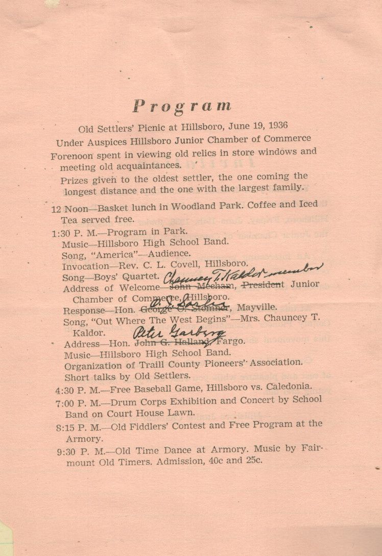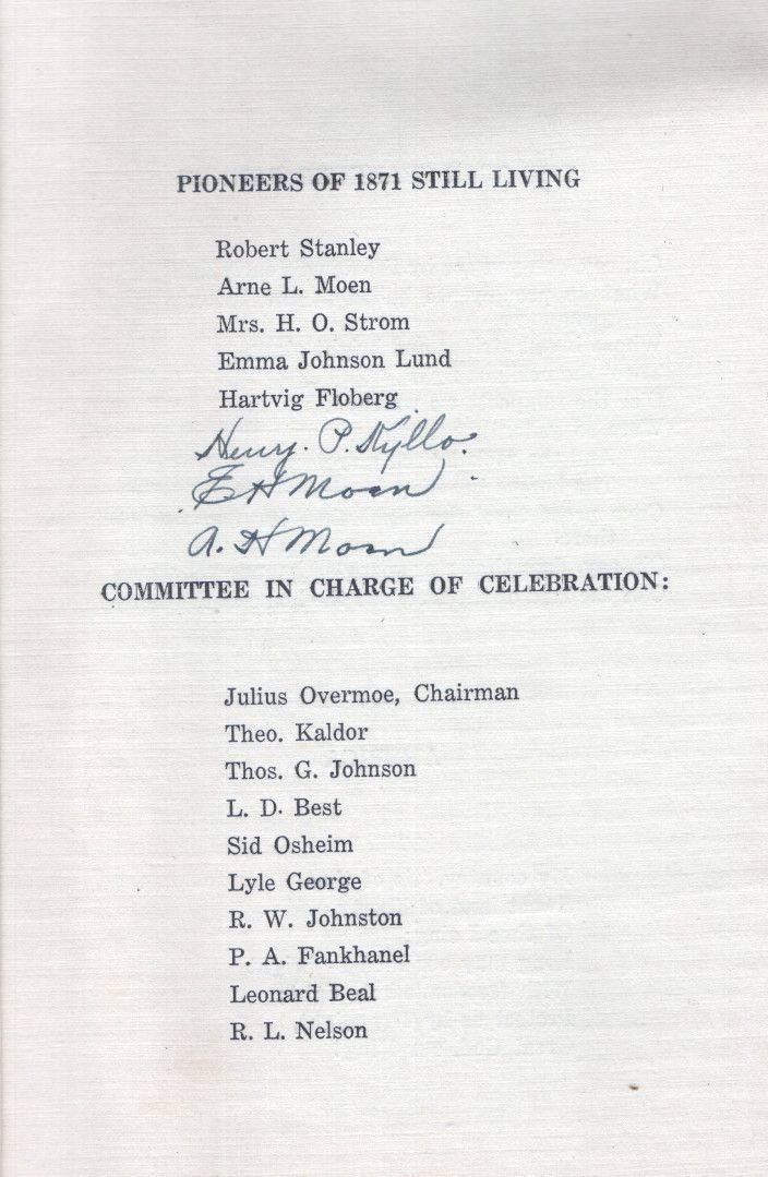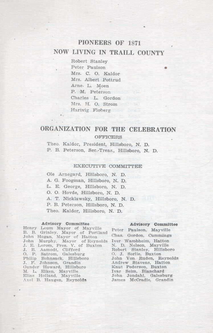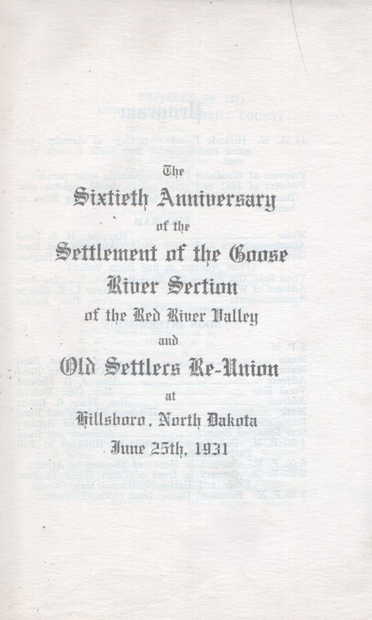(1) the Program for the Sixtieth Anniversary of the Settlement of the Goose River Section of the Red River Valley and Old Settlers Reunion held in Hillsboro, ND, on 25 June 1931, which includes the names of 1871 Pioneers now living in Traill County (see below); also ten pages of signatures of those who attended the Old Settlers Reunion on 25 June 1931, which including the year they arrived in Traill County;