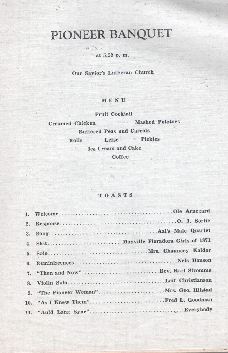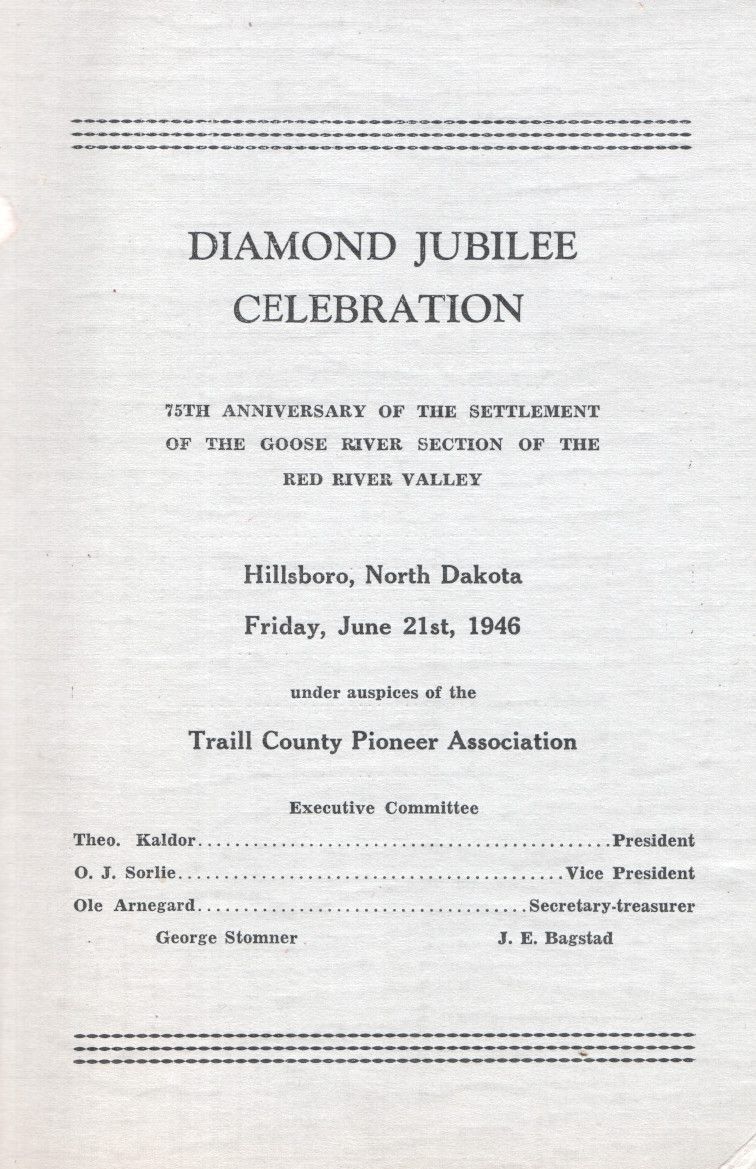 (4) the Program and Banquet for the Diamond Jubilee Celebration of the 75th Anniversary of the Settlement of the Goose River Section of the Red River Valley held in Hillsboro, ND, on 21 June 1946 (see below), and four pages of signatures of those who attended the program, which included the year they arrived in Traill County.
