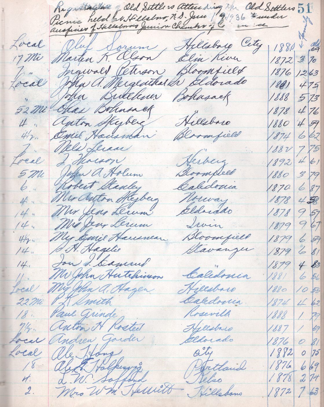 (2) the Program for the Old Settlers Picnic held at Hillsboro, ND, on 19 June 1936, and three pages of names of those who attended the Old Settlers Reunion on 25 June 1931 (see below), which including the year they arrived in Traill County;