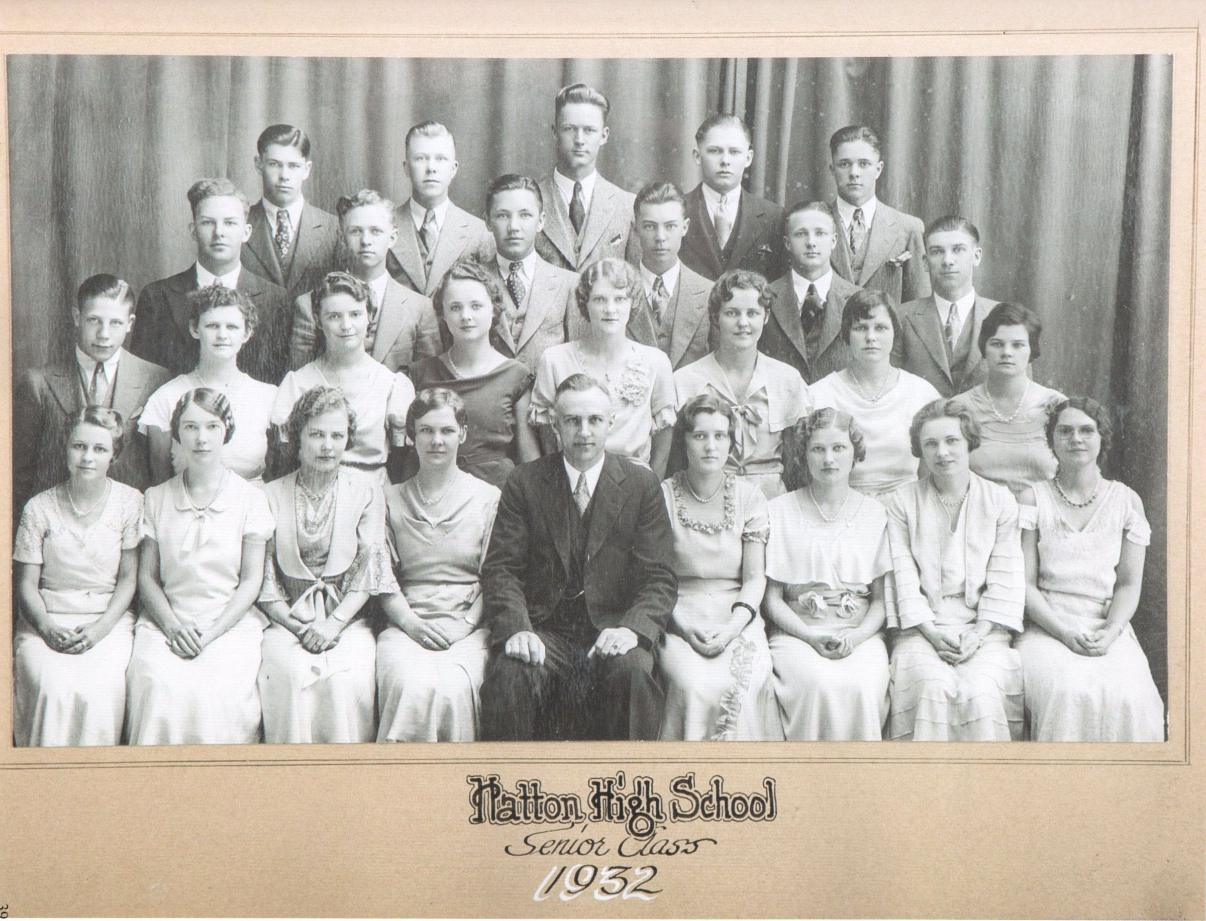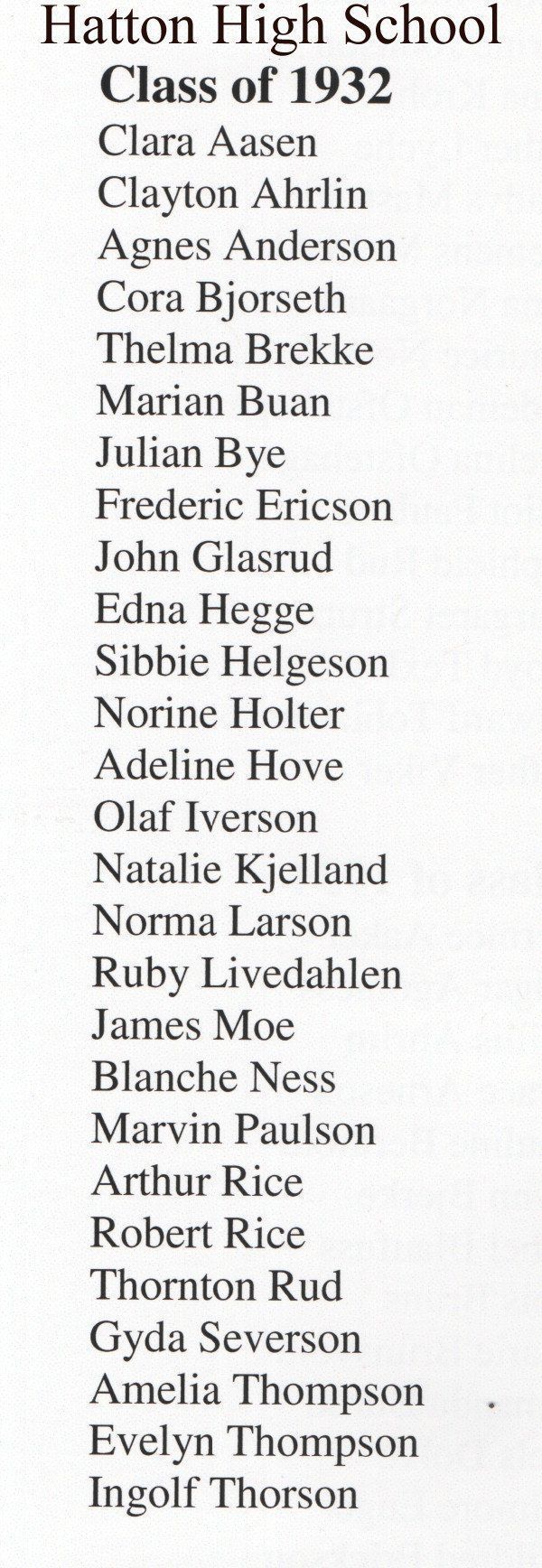 Hatton High School Class of 1932 seniors included: Clara Aasen, Clayton Ahrlin, Agnes Anderson, Cora Bjorseth, Thelma Brekke, Marian Buan, Julian Bye, Frederic Ericson, John Glasrud, Edna Hegge, Sibbie Helgeson, Norine Holter, Adeline Hove, Olaf Iverson, Natalie Kjelland, Norma Larson, Ruby Livedahlen, James Moe, Blanche Ness, Marvin Paulson, Arthur Rice, Robert Rice, Thornton Rud, Gyda Severson, Amelia Thompson, Evelyn Thompson, and Ingolf Thorson.
