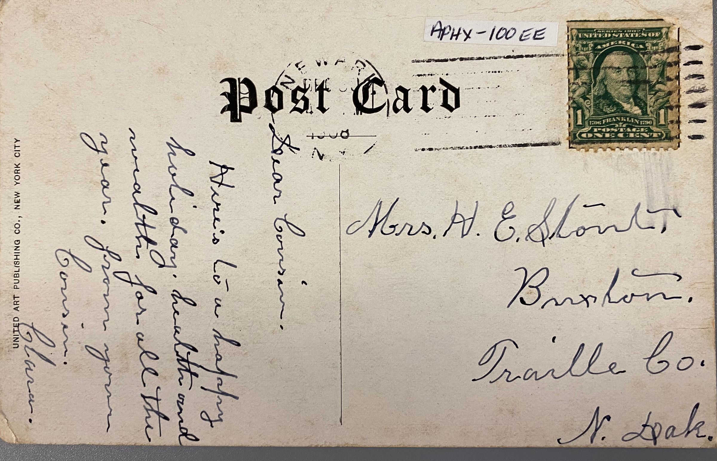 Postcard to Mrs. H. E. Stout in Buxton - December 1908Entry/Object ID