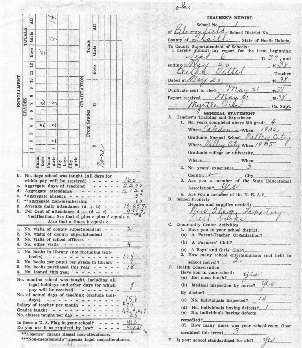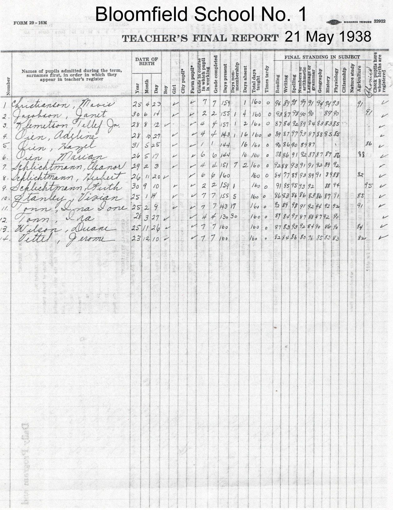 On 20 May 1938, Bloomfield School No. 1 teacher Bertha Vettel reported attendances and standings in studies pursued for 14 students, including Mavis Christianson, Janet Jacobson, Tellef Klemetson, Adeline Oien, Hazel Oien, Marian Oien, Eleanor Schlichtmann, Herbert Schlichtmann, Ruth Schlichtmann, Vivian Stanley, Ina Ione Tonn, Ira Tonn, Duane Wilson, and Jerome Vettel.