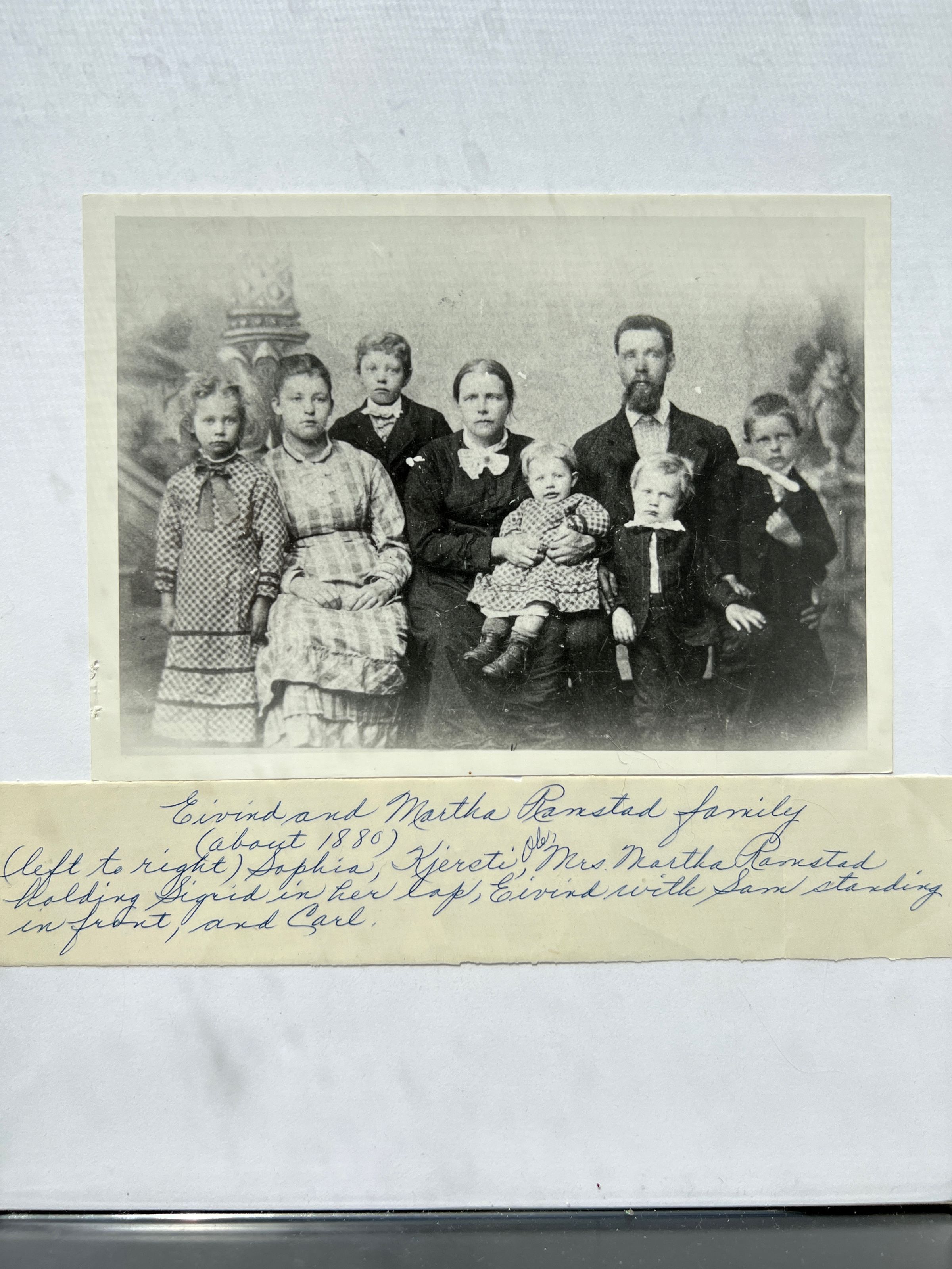 This file has a photograph of Eivind and Martha Ramstad, and their children, in about 1880; The note has their children's names.Cataloged By