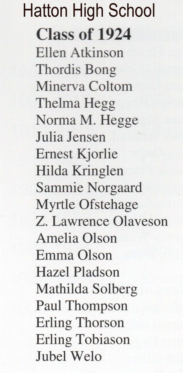 Hatton High School Class of 1924 seniors included: Ellen Atkinson, Thordis Bong, Minerva Coltom, Norma M. Hegge, Thelma Hegge, Julia Jenson, Ernest Kjorlie, Hilda Kringlen, Sammie Norgaard, Myrtle Ofstehage, Z. Lawrence Olaveson, Amelia Olson, Emma Olson, Hazel Pladson, Mathilda Solberg, Paul Thompson, Erling Thorson, Erling Tobiason, and Jubel Welo.