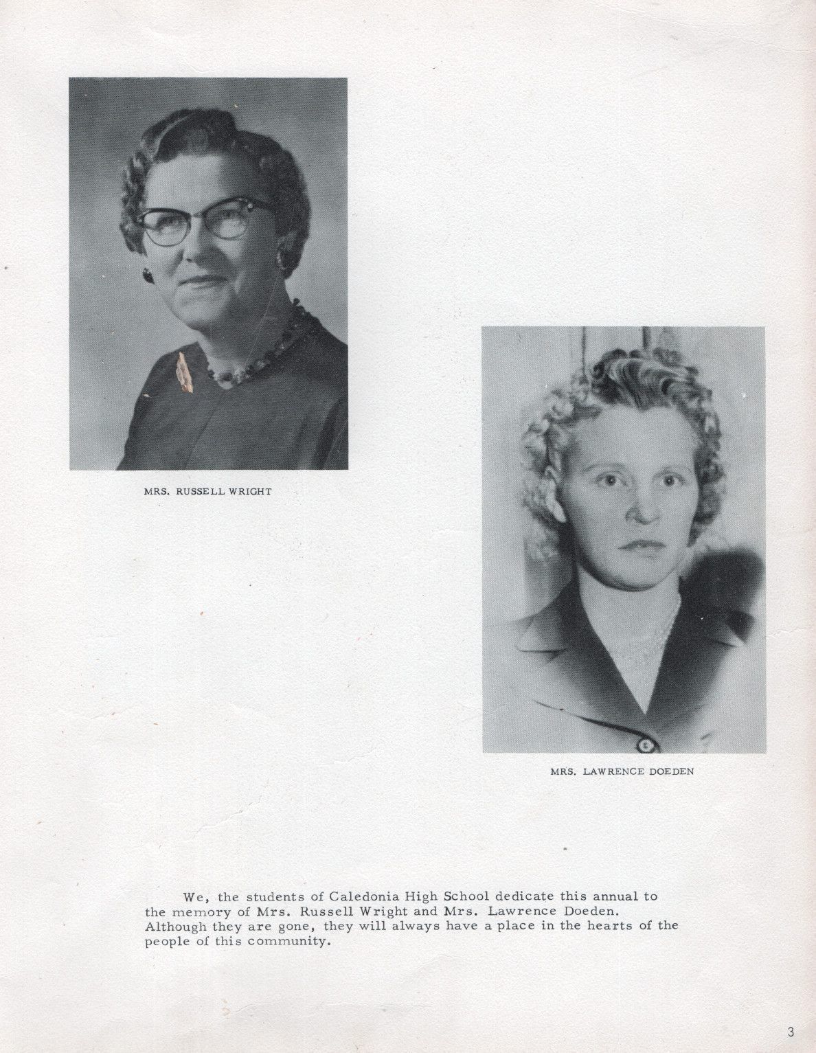 The Class of 1957 Caledonia High School Yearbook, titled "1957 Tiger", was published by the students of Caledonia High School, 1956-57. This yearbook was dedicated to Mrs. Lawrence Doeden and Mrs. Russell Wright.