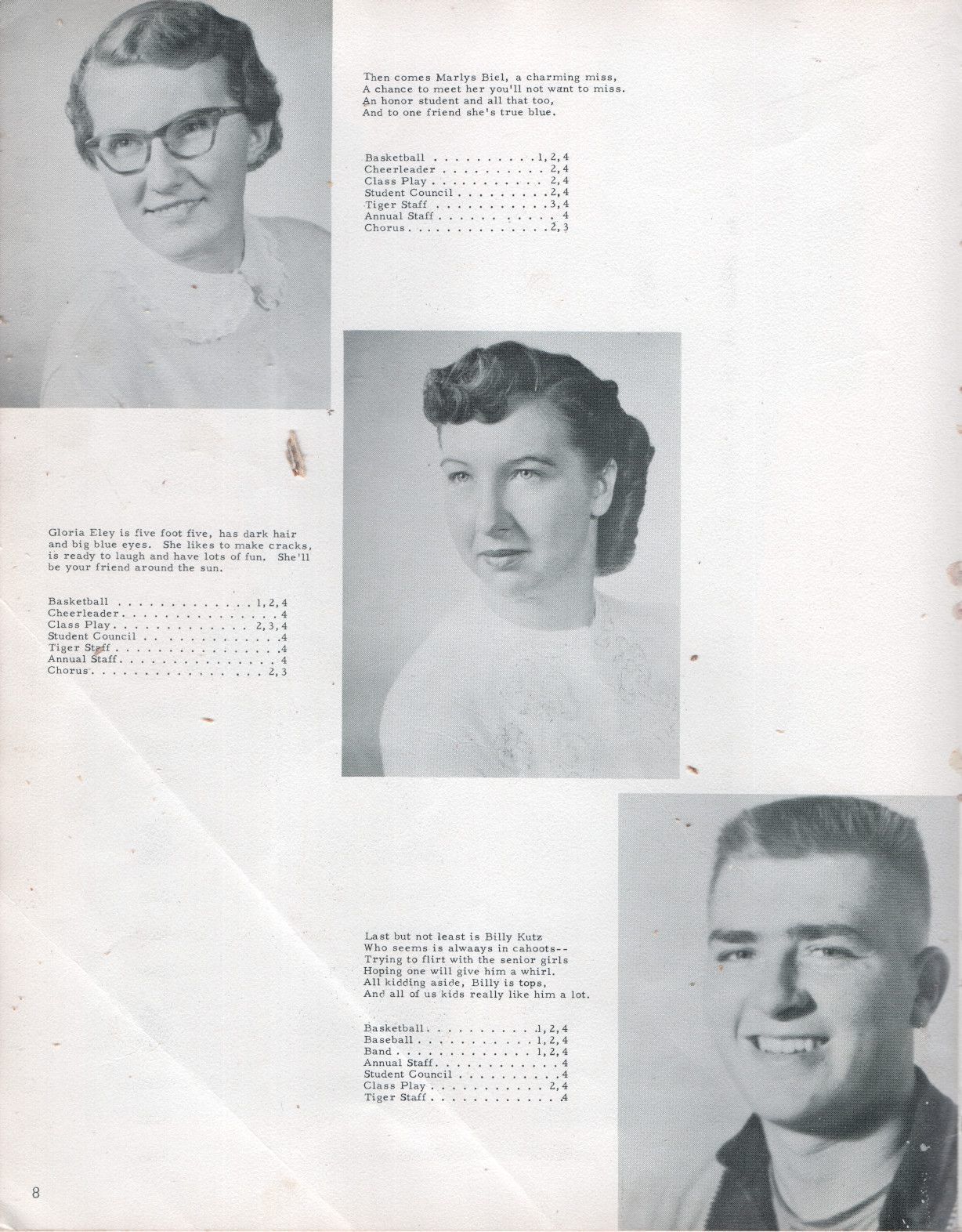 The Senior Class of 1957 yearbook had three student photos: Marlys Biel, Gloria Eley, and Billy Kutz.