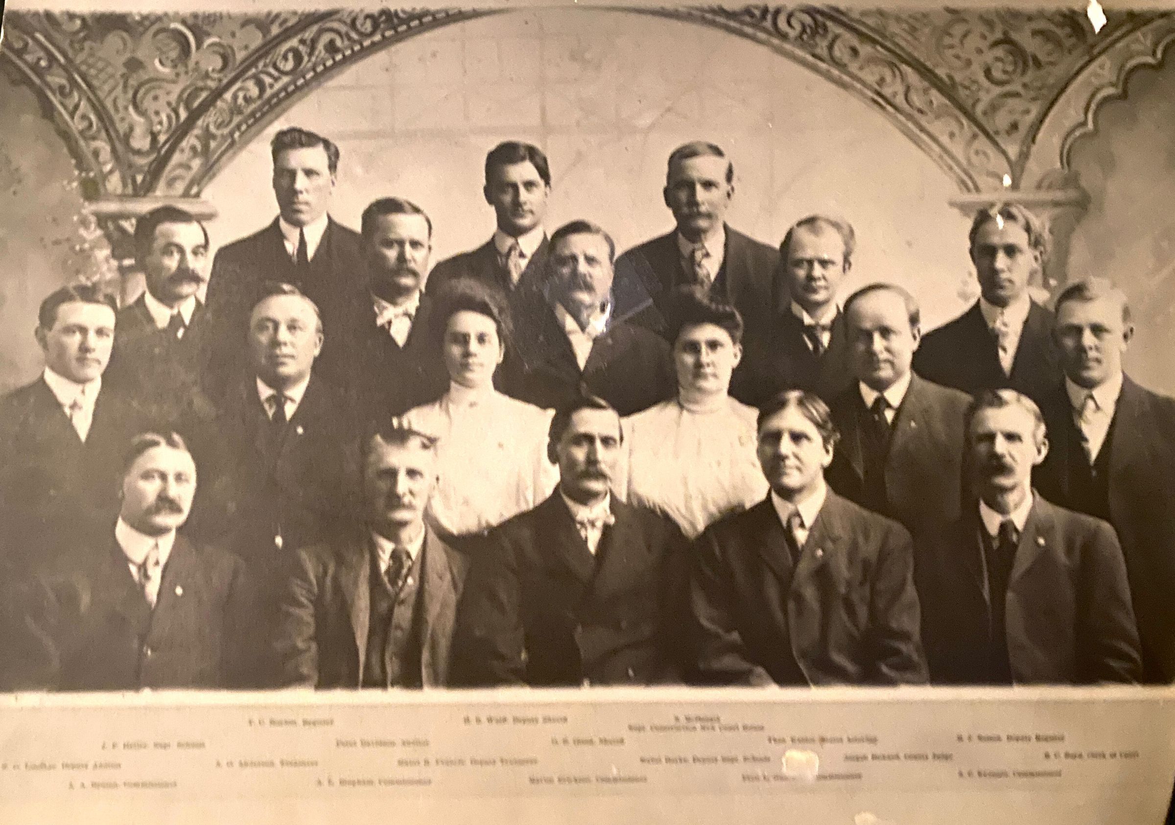 Third Row - J. F. Hetler, Superintendent of Schools; Peter Davidson, Auditor; O. B. Olson, Sheriff; Theodore Kaldor, States Attorney; & M. J. Nelson, Deputy Register.