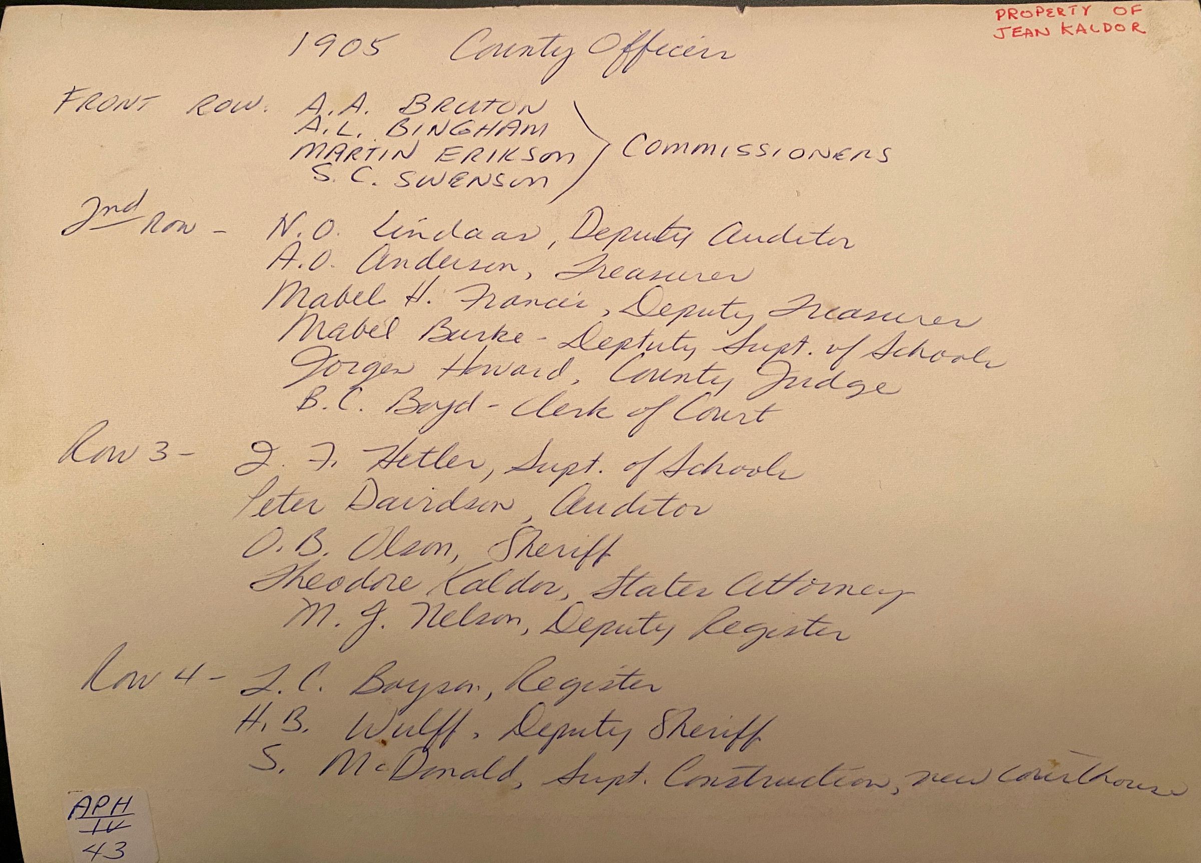 Back Row - T. C. Boyson, Register, H. B. Wulff, Deputy Sheriff; & S McDonald, Superintendent of Construction of the new courthouse.Subject Person or Organization
