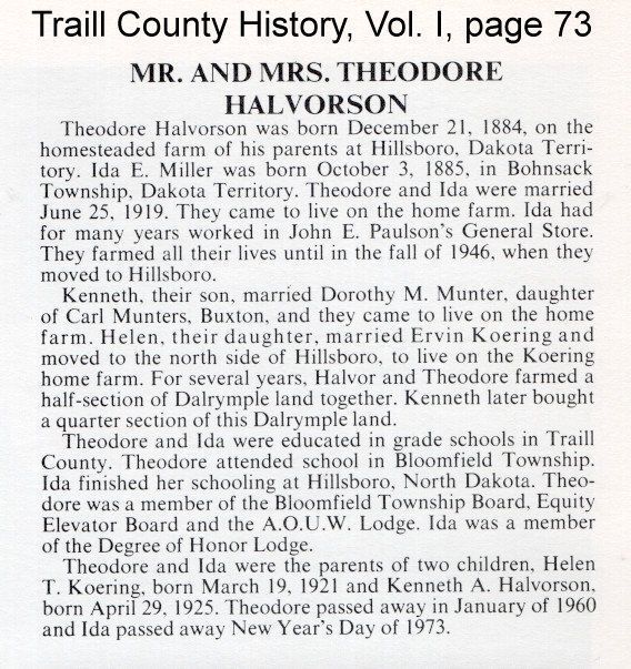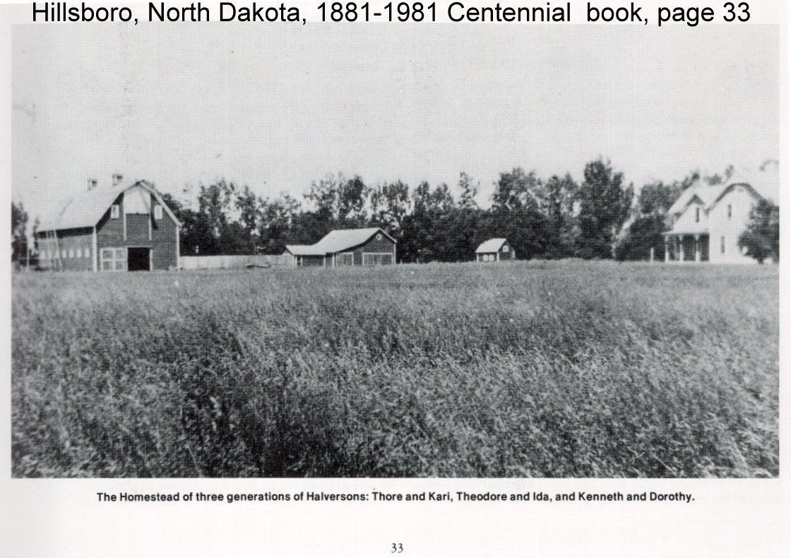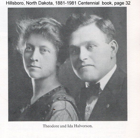 This Halvorson family history entry describes the lives of Theodore and Ida (Miller) Halvorson (see below), and how they inherited the farmstead of Theo's parents, Thore and Kari (Larsdatter) Halvorson located in Bloomfield Township, Traill County, North Dakota (see below). This farmstead became a century farm because Theo Halvorson passed it on to his son Kenneth Halvorson. This historic homestead is now owned by Tim Kozojed of Hillsboro.Acquisition