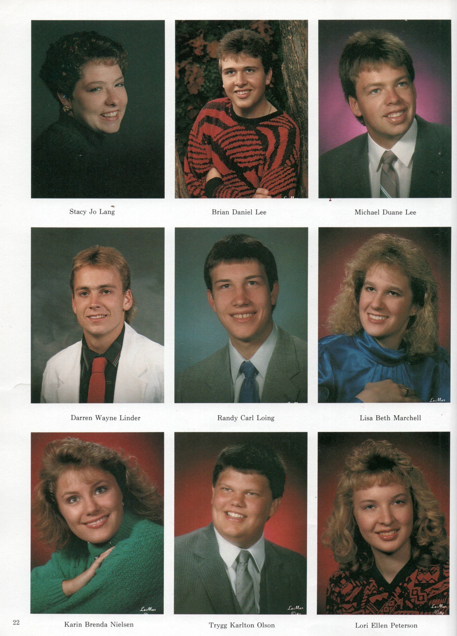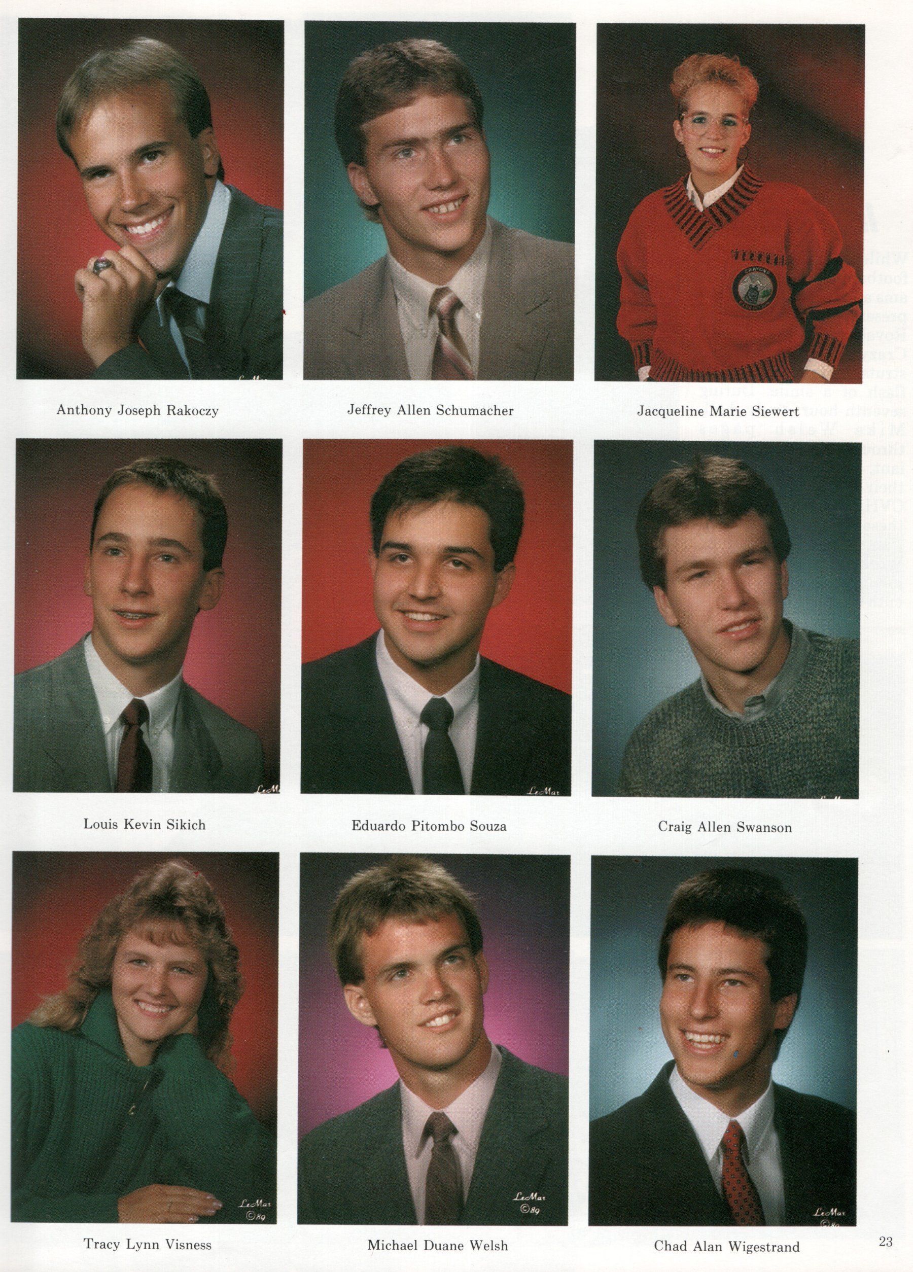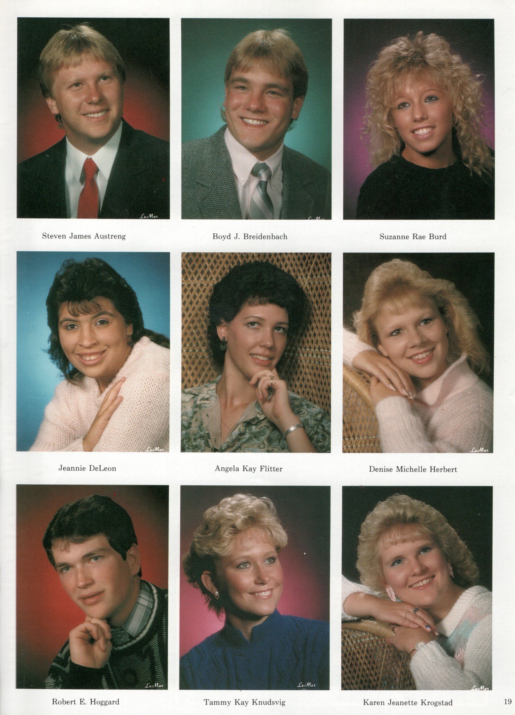 The Senior Class of 1989 yearbook had 27 student photos: Steven Austreng, Boyd Breidenbach, Suzanne Rae Burd, Jeannie DeLeon, Angela Kay Flitter, Denise Herbert, Robert Hoggard, Tammy Knudsvig, Karen Krogstad, Stacy Jo Lang, Brian Lee, Michael Lee, Darren Linder, Randy Loing, Lisa Marchell, Karin Nielsen, Trygg Olson, Lori Peterson, Anthony Rakoczy, Jeffrey Schumacher, Jacqueline Siewert, Louis Sikich, Eduardo Souza, Craig Swanson, Tracy Visness, Michael Welsh, and Chad Wigestrand.