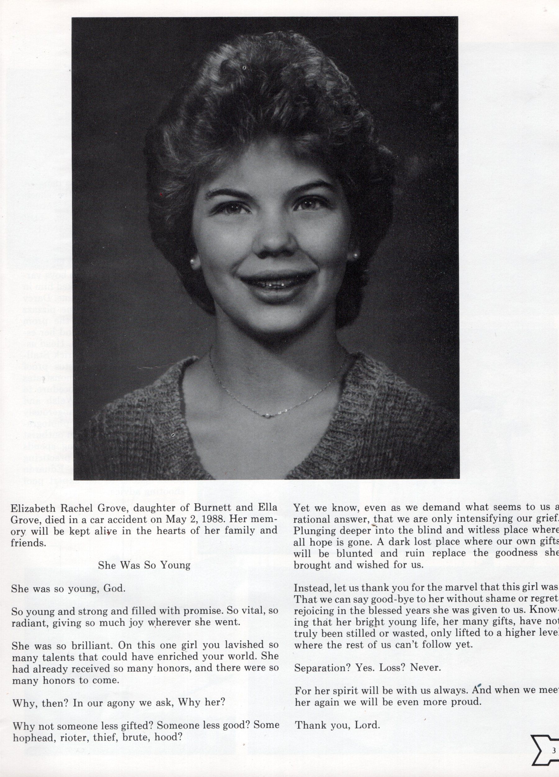 The Class of 1989 Central Valley High School Yearbook, titled "Valiant", was produced by Annual Staff students. This yearbook was dedicated to Elizabeth Rachel Grove, who died in a car accident in 1988.