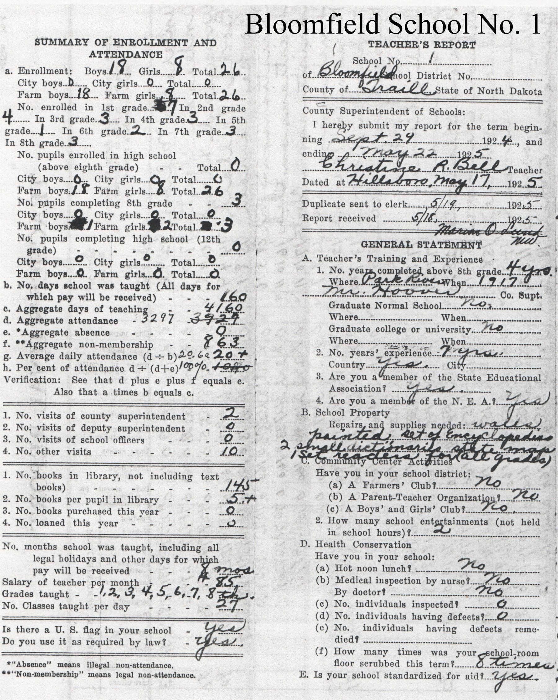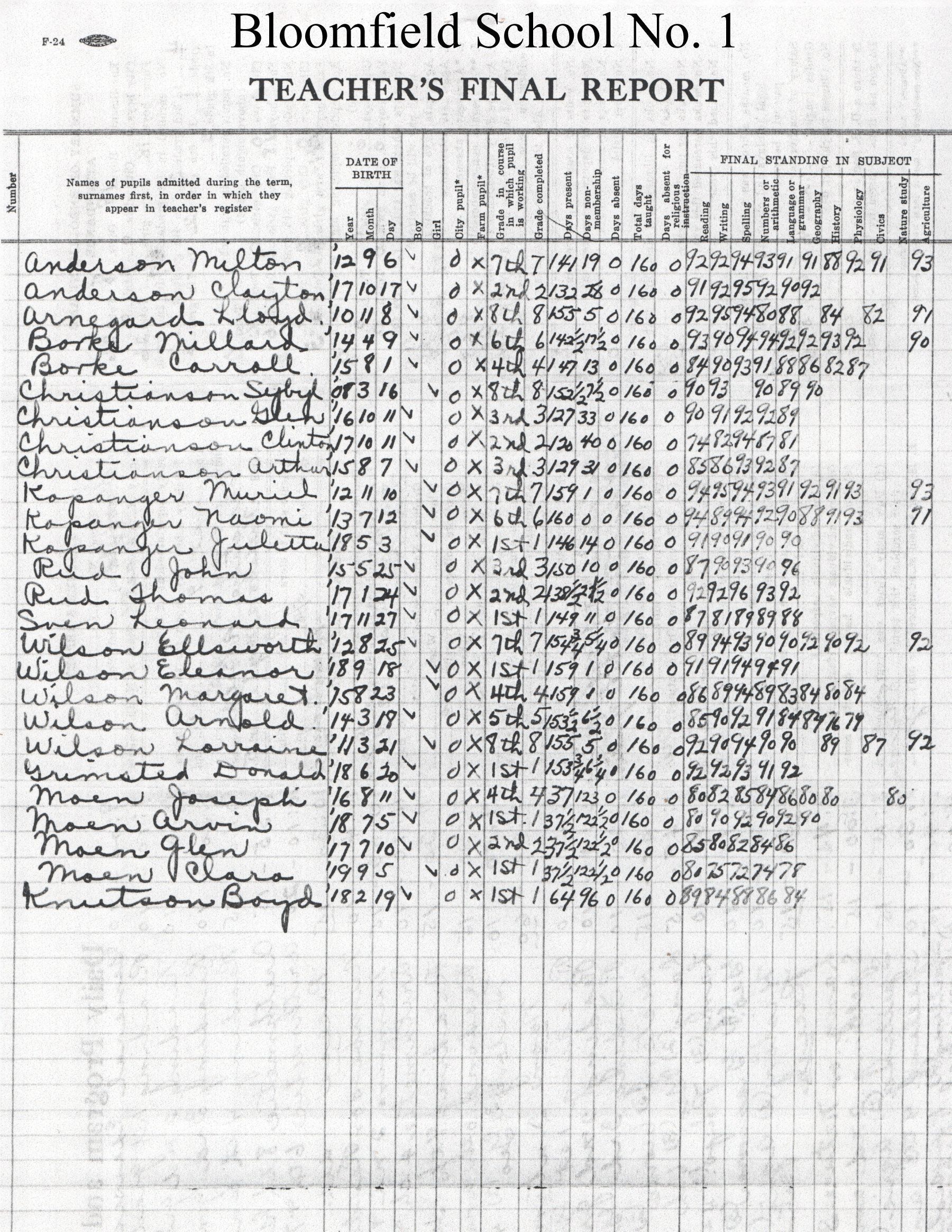 On 17 May 1925, Bloomfield School No. 1 teacher Christine Bell reported attendances and standings in studies pursued for 26 students, including Clayton Anderson, Milton Anderson, Lloyd Arnegard, Carroll Borke, Millard Borke, Arthur Christianson, Clinton Christenson, Glen Christianson, Sybel Christianson, Donald Grimsted, Juletta Kopanger, Muriel Kopanger, Naomi Kopanger, Boyd Knutson, Arvin Moen, Clara Moen, Glen Moen, Joseph Moen, John Rud, Thomas Rud, Leonard Sven, Arnold Wilson, Eleanaor Wilson, Ellsworth Wilson, Lorraine Wilson, and Margaret Wilson.
