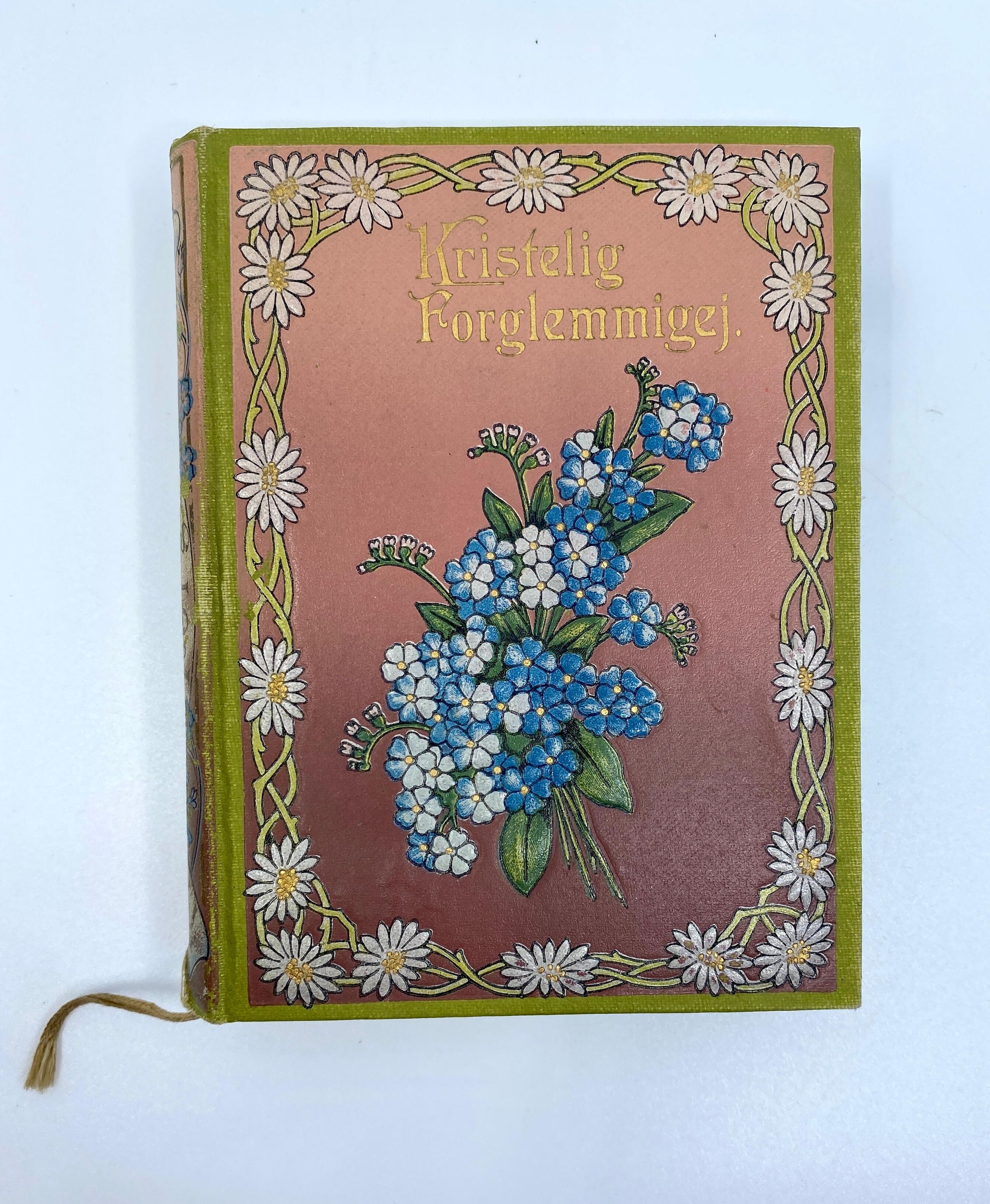 A colorful book cover titled: Kristelig Forglemmegei, or Norwegian for Christian Forgetfulness, on what is a Norwegian bible.Cataloged By